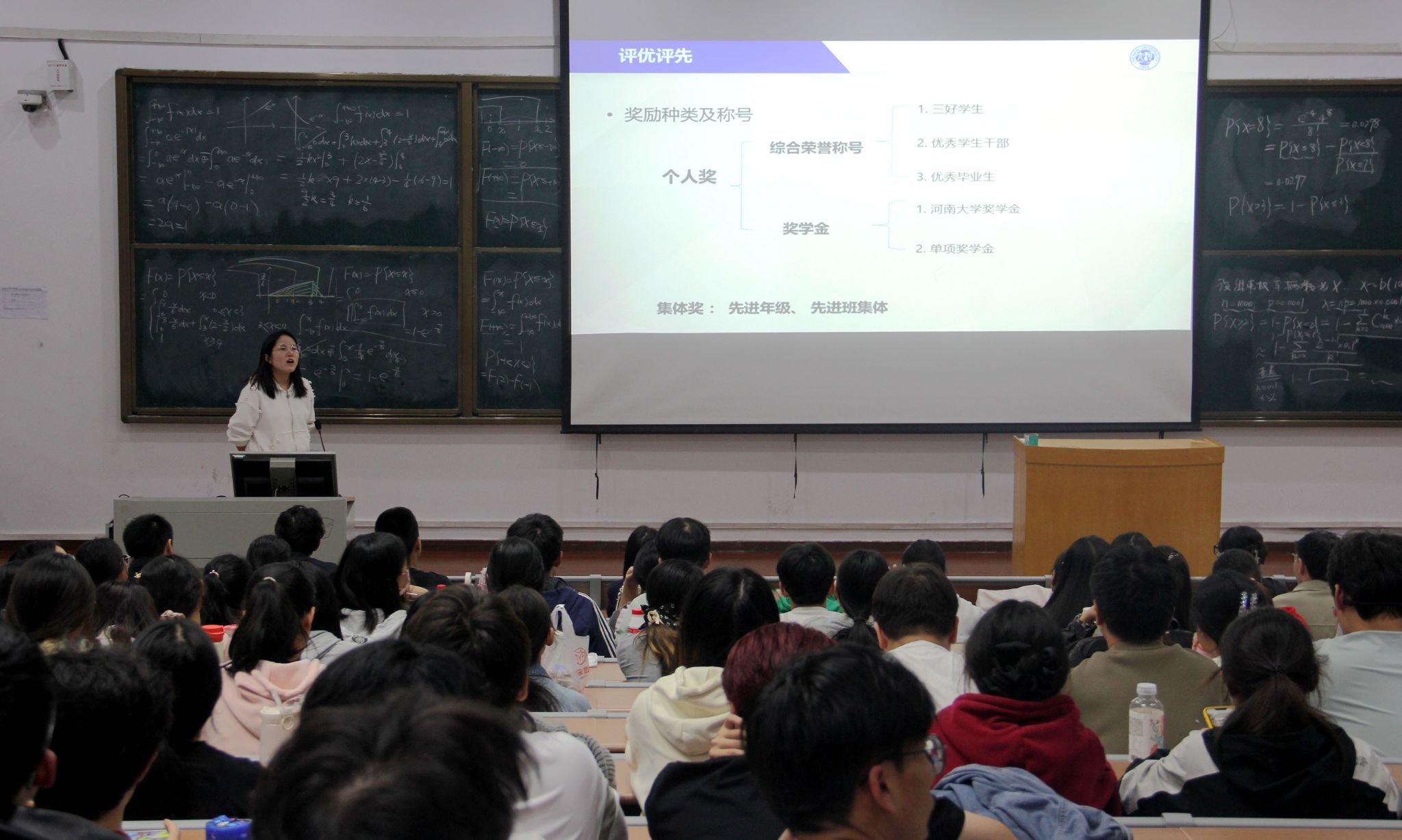 会议伊始,屈利铭带领与会学生学习了《河南大学学生手册》和《高等学校学生行为准则》的相关内容,阐述了在校学生所享有的权利和应当履行的义务。她表示大学生在校期间应当强化底线意识,养成良好的行为规范。在学生奖励与处分方面,她向与会学生介绍了三好学生、优秀学生干部等评优评先的基本条件和评价标准,同时提到了国家奖学金、国家励志奖学金、河南大学奖学金等各类奖学金的申请要求和奖励方法,并借此鼓励学生们学习先进,勇争上游,努力取得属于自己的奖励与荣誉。最后,屈利铭总结了上一学年以及学生近期的学习生活情况,鼓励学生们努力学习,把握大二学年这一关键阶段,积极参与实践活动与专业竞赛,促进自身全面发展,在未来的大学生活中书写自己的华丽篇章。