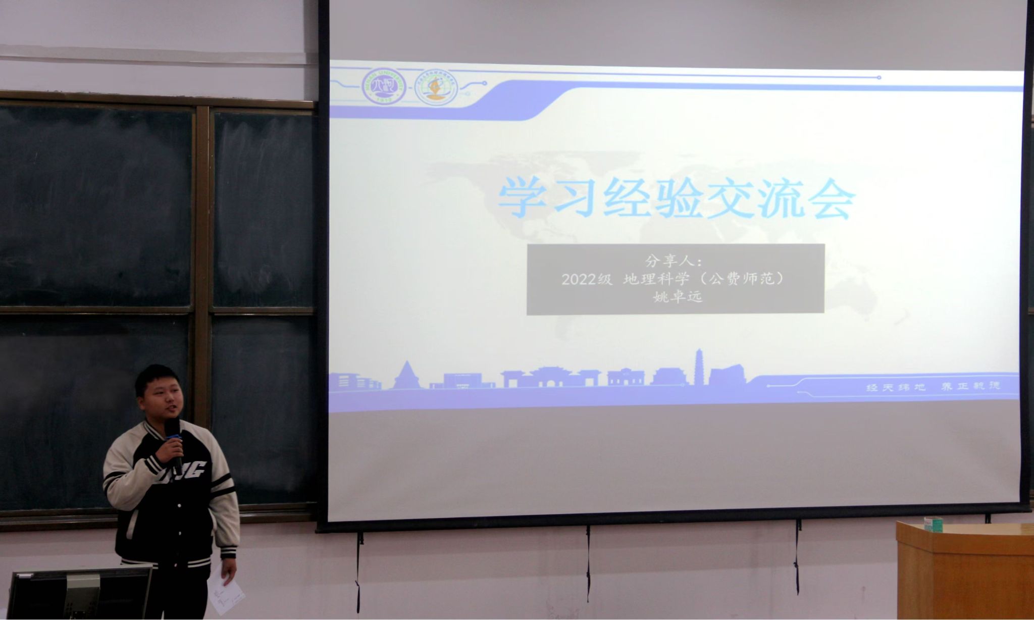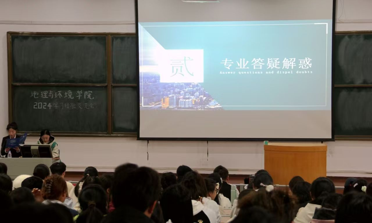 概况和学科建设情况进行简要介绍后,学生代表依次对各个专业进行解说,并向2024级新生分享自己在大学生活中的经验及对未来发展规划的建议。姚卓远从公费师范专业的角度出发,就专业优势与限制两方面进行阐述,强调了提升教学能力的重要性,提醒新生加强对三板内容的练习,为未来成为一名优秀的人民教师打下坚实基础。付小博则详细介绍了测绘工程专业的就业前景与发展现状,建议新生打好专业基础,明确专业需求,并给予新生鼓励。黄雅婷结合自身经历建议新生采取灵活的方式学习,将理论与知识相结合,鼓励新生积极与教师沟通,锻炼自己的科研能力。
