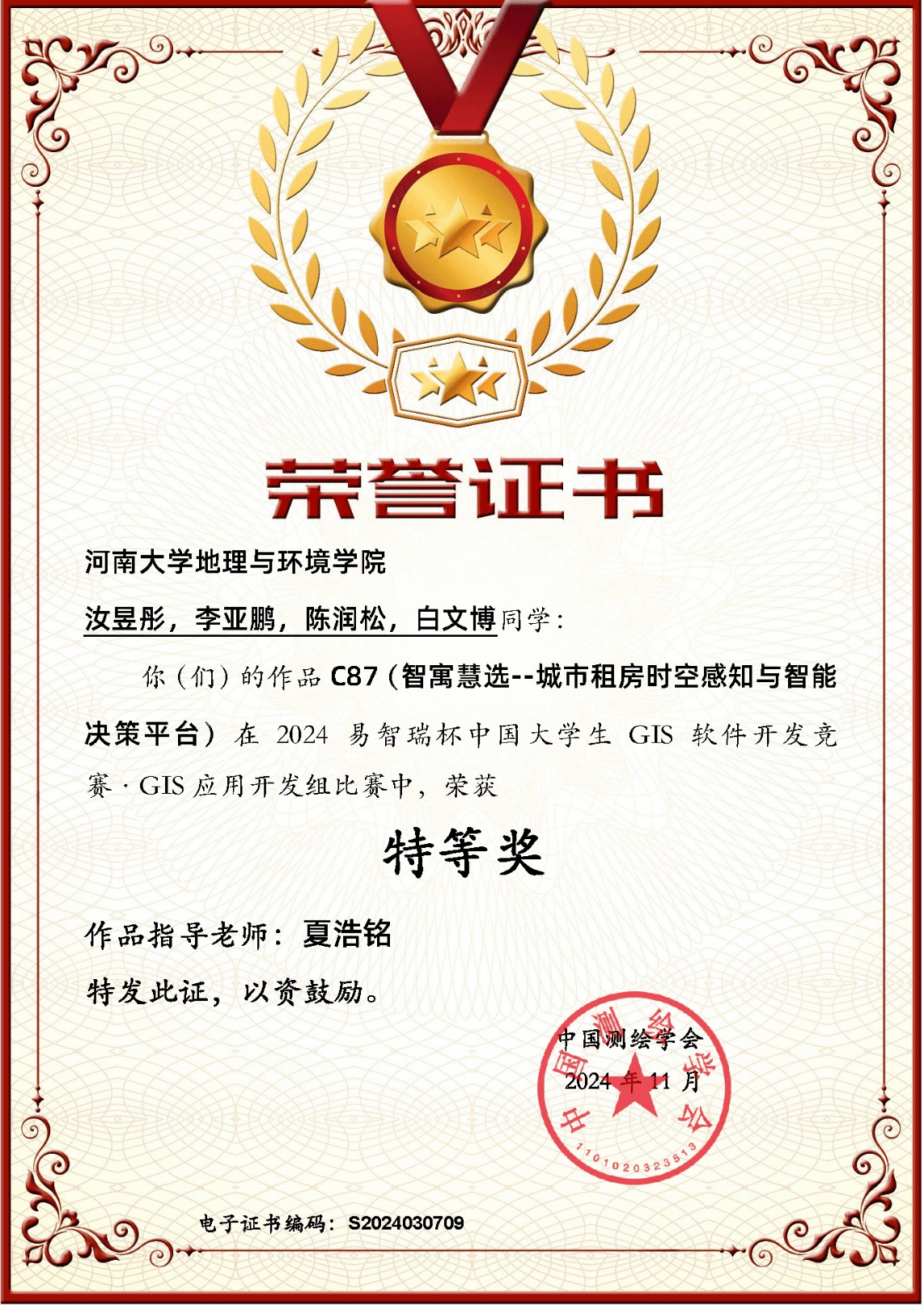 2024年11月6日,中国测绘学会“易智瑞杯中国大学生GIS软件开发竞赛•GIS应用开发组”决赛在北京国际会议中心落下帷幕。我院夏浩铭老师指导的地理信息科学专业本科生代表队(汝昱彤、李亚鹏、陈润松、白文博),开发的作品C87(智寓慧选——城市租房时空感知与智能决策平台)在众多优秀作品中脱颖而出,荣获大赛唯一的特等奖,优秀指导老师奖。