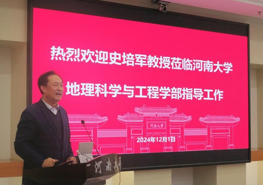史培军首先从国内外地理学会下设学科、地理学年会、地球系统研究和联合国关注全球问题四个方面介绍了地理学的发展,随后立足人类世时代、地球系统风险防范和地理学综合研究的前沿与热点等七个维度提出对地理学未来的前瞻性展望,最后表达了对河南大学地理学未来发展的殷切期望。史培军在讲话中提到,河南大学地理学科拥有深厚的历史底蕴和良好的发展基础,他期望未来河南大学地理学能够紧紧围绕国家战略需求,深化理论研究,创新实践应用,培养更多高素质的地理学人才,为我国地理学科的发展贡献力量。