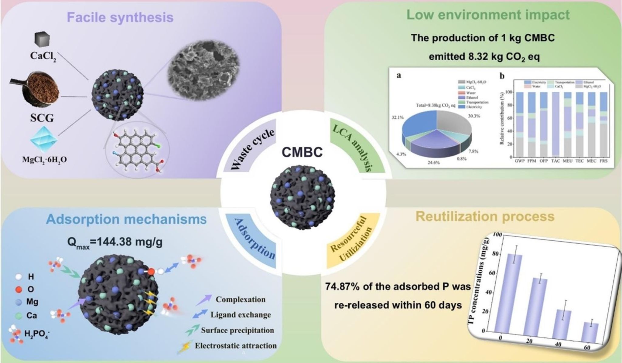 近日,我院王洋洋副教授课题组在Chemical Engineering Journal(一区top期刊,IF=13.3)上发表了题为“Low-cost Ca/Mg co-modified biochar for effective phosphorus recovery: Adsorption mechanisms, resourceful utilization, and life cycle assessment”的研究成果。该研究证实低成本且绿色的金属改性生物炭能够高效回收废水中的磷,并且能够进一步用做缓释肥料。
