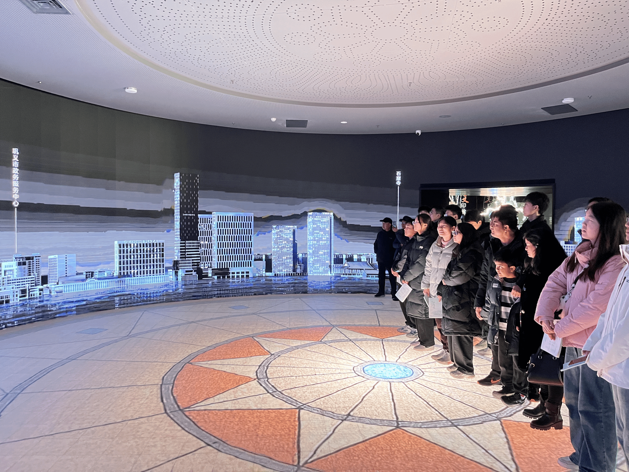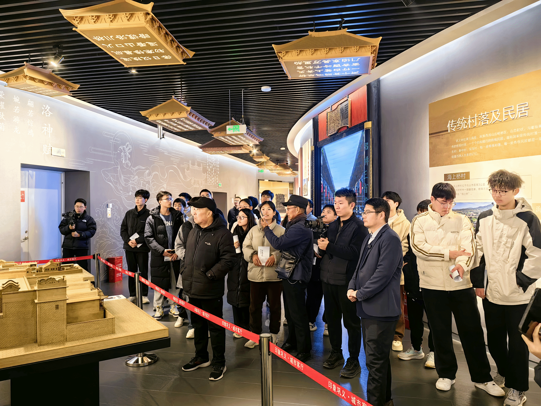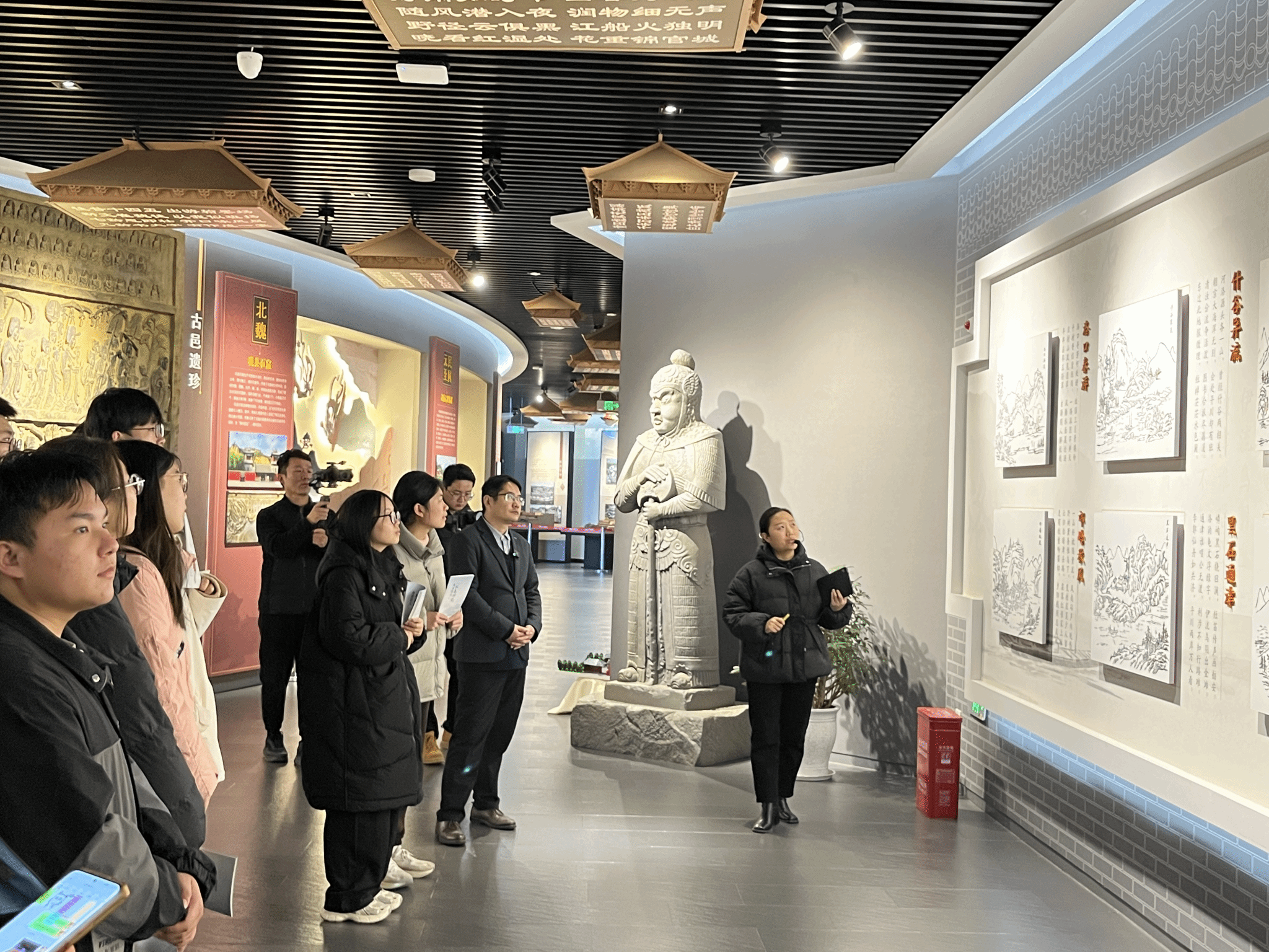 活动首站为印象巩义城市展厅,主要围绕巩义市的历史沿革、城市规划等多个方面展开实习。进入展馆,映入眼帘的是“诗圣故里 河洛巩义”八个大字,抬头则是悉心勾勒的邙山洛水,这使学生们深刻领略到巩义深厚的历史文化底蕴。根据展览设置,师生们首先走进多媒体沉浸式艺术演绎厅,其通过声、电、光、影等视频宣传片形式,围绕着巩义的山、水和城展示了巩义市的整体概况。康百万、慈云寺、石窟寺、千年帝陵、诗圣杜甫、洛神赋、河洛汇流等,无不让师生为之震撼,并深刻地感受到了大美巩义的独特魅力。