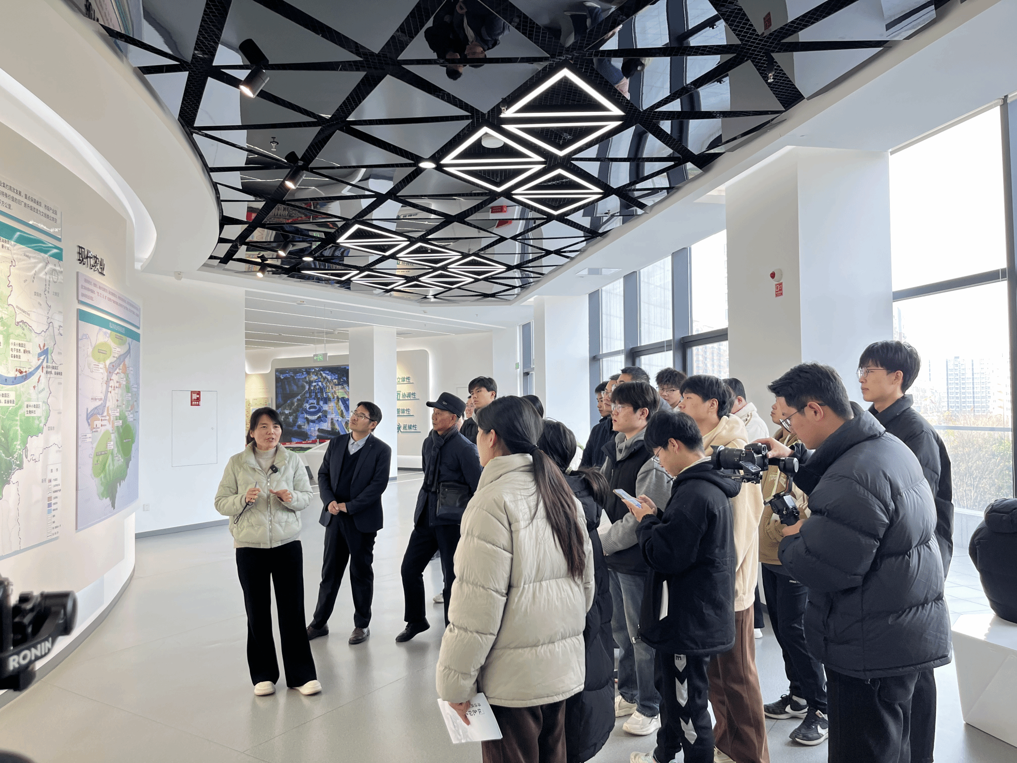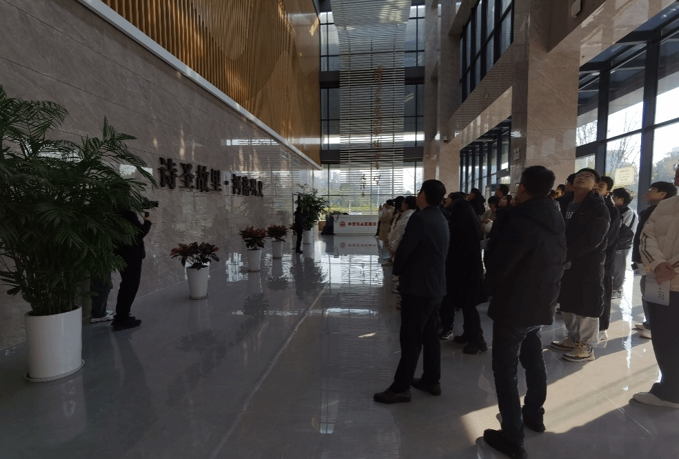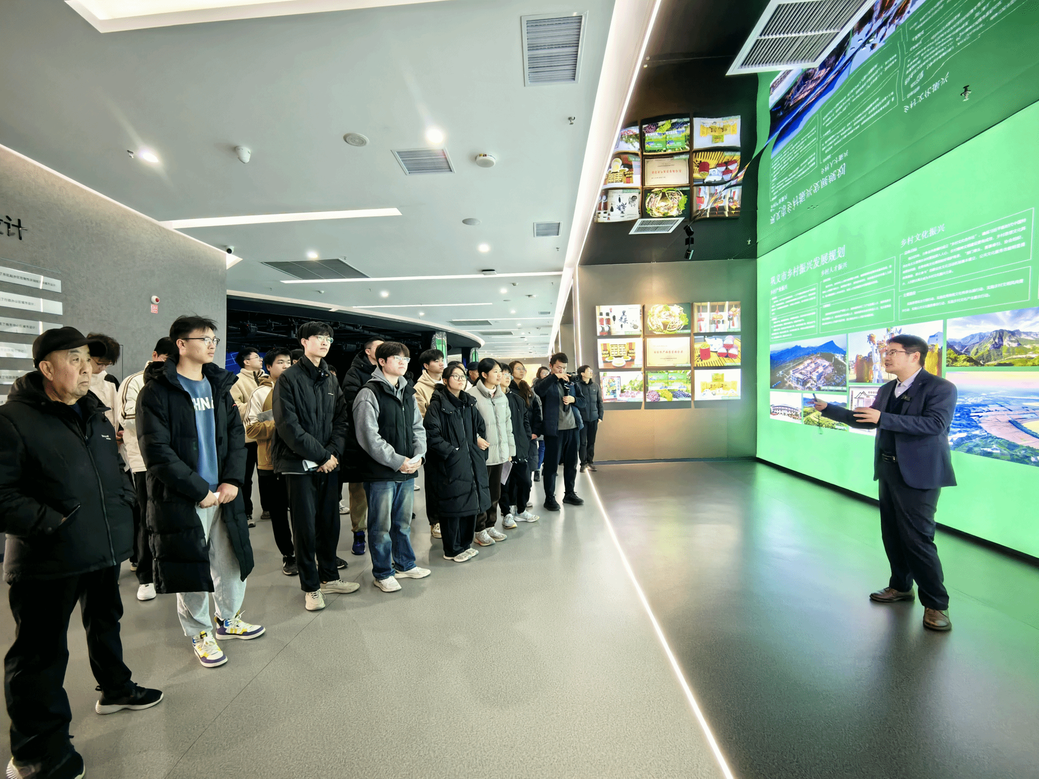 活动首站为印象巩义城市展厅,主要围绕巩义市的历史沿革、城市规划等多个方面展开实习。进入展馆,映入眼帘的是“诗圣故里 河洛巩义”八个大字,抬头则是悉心勾勒的邙山洛水,这使学生们深刻领略到巩义深厚的历史文化底蕴。根据展览设置,师生们首先走进多媒体沉浸式艺术演绎厅,其通过声、电、光、影等视频宣传片形式,围绕着巩义的山、水和城展示了巩义市的整体概况。康百万、慈云寺、石窟寺、千年帝陵、诗圣杜甫、洛神赋、河洛汇流等,无不让师生为之震撼,并深刻地感受到了大美巩义的独特魅力。