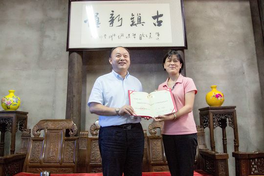 对叶永明先生受聘河南大学表示热烈的欢迎和衷心的感谢。她说,叶永明先生是河南省著名企业家、开封市朱仙镇历史文化研究院院长,叶先生的加盟,必将进一步促进我院旅游管理专业人才培养、师资队伍建设、专业实习基地建设等方面的快速发展。他希望,叶先生能够综其所长,为我院培养出更多适合地方经济发展需求的建设人才。