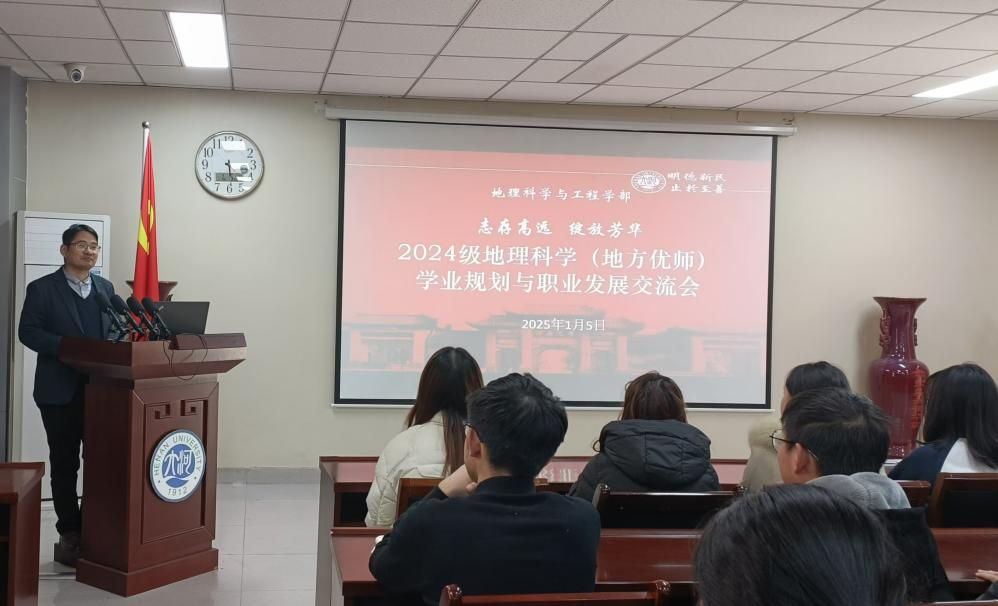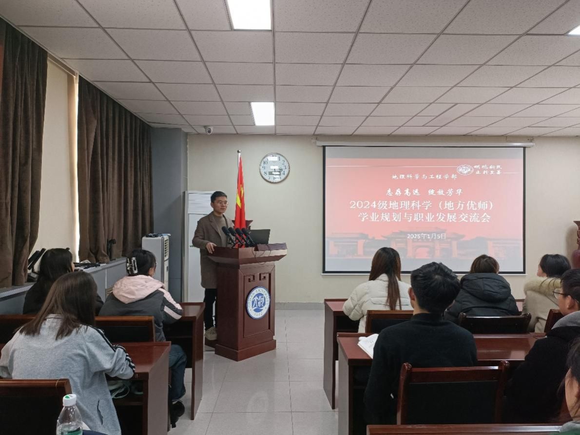 1月5日,在面向我部2024级地理科学(地方优师)学生的会议上,丁志伟详细说明了“地方优师计划”生应具备的本领和技能,他不仅鼓励学生们要扎实基础,拓宽视野,不断提升自己的综合素质和专业能力,以追求更高远的职业发展,同时强调了作为“地方优师计划”生所应肩负的责任与使命。