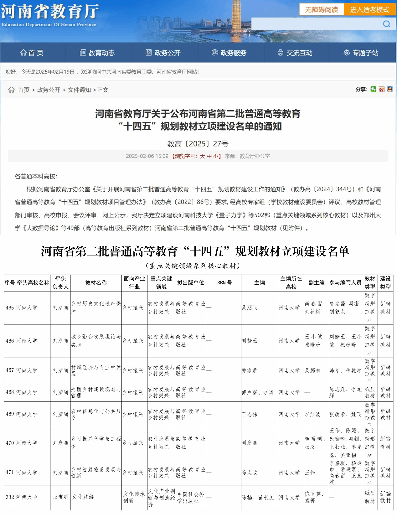 近日,河南省教育厅公布了第二批普通高等教育“十四五”规划教材立项建设名单,我部申报的《乡村历史文化遗产保护》等8部教材入选重点关键领域系列核心教材。这些教材的入选体现了河南大学地理科学与工程学部在教育教学改革方面取得的教材建设成效。