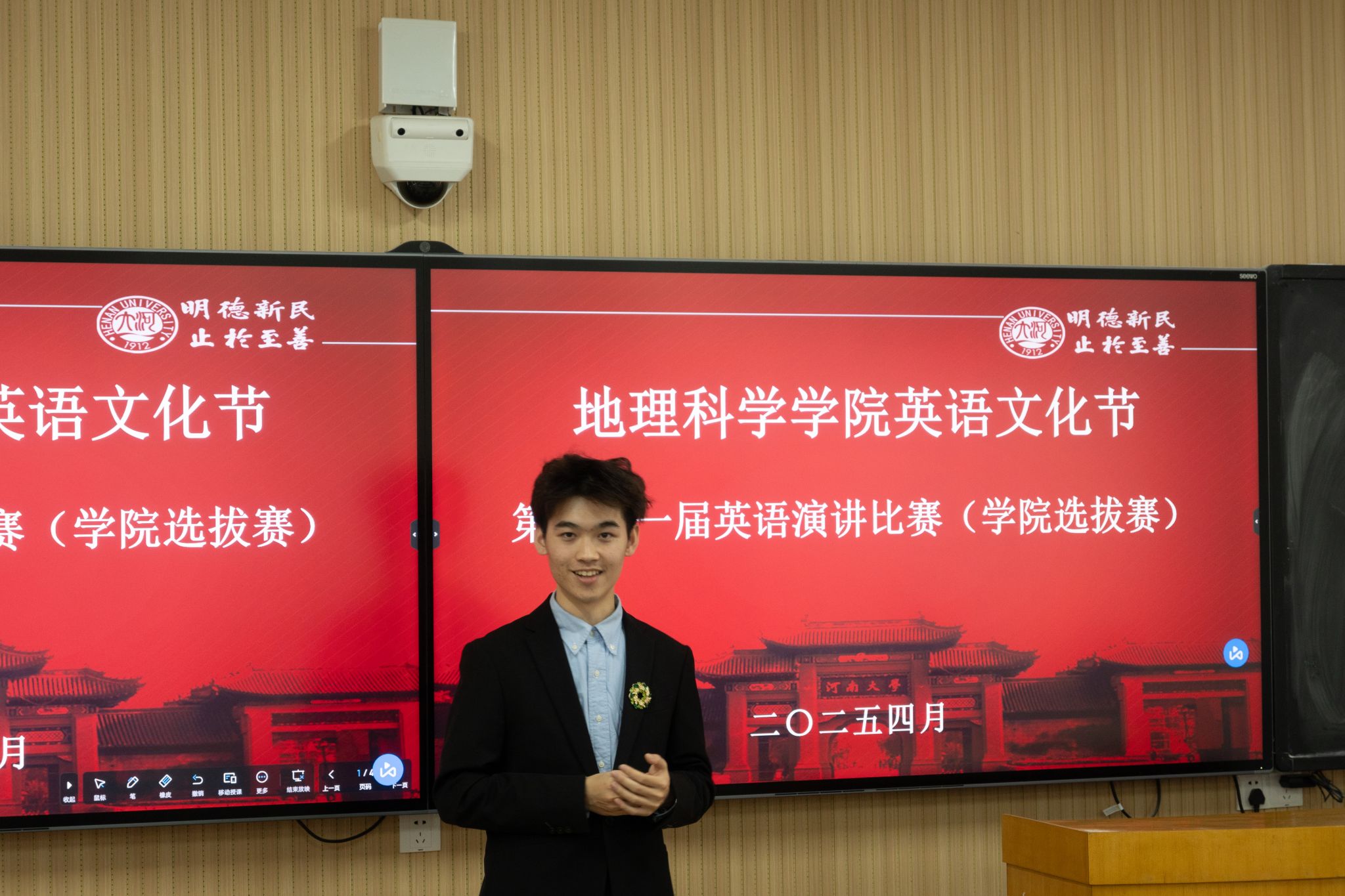 比赛开始,赵雨梦宣读比赛目的与规则,并对几位评委的到来表示热烈欢迎。过程中,选手们依次登台,以自信昂扬的姿态展开演讲。他们激情澎湃,用充满感染力的语言诠释对时代命题的深刻思考,标准的发音、流畅的表达配合恰到好处的肢体语言,展现出非凡的演讲风采。面对评委抛出的问题,他们从容不迫,逻辑清晰,用流利的英语展示了思考的深度,用自信的姿态传递了青春的力量,思维交锋间彰显智慧与思辩,赢得了在场观众的掌声。最后,评委们根据选手们的演讲内容、口语表达能力及仪态举止进行综合打分。