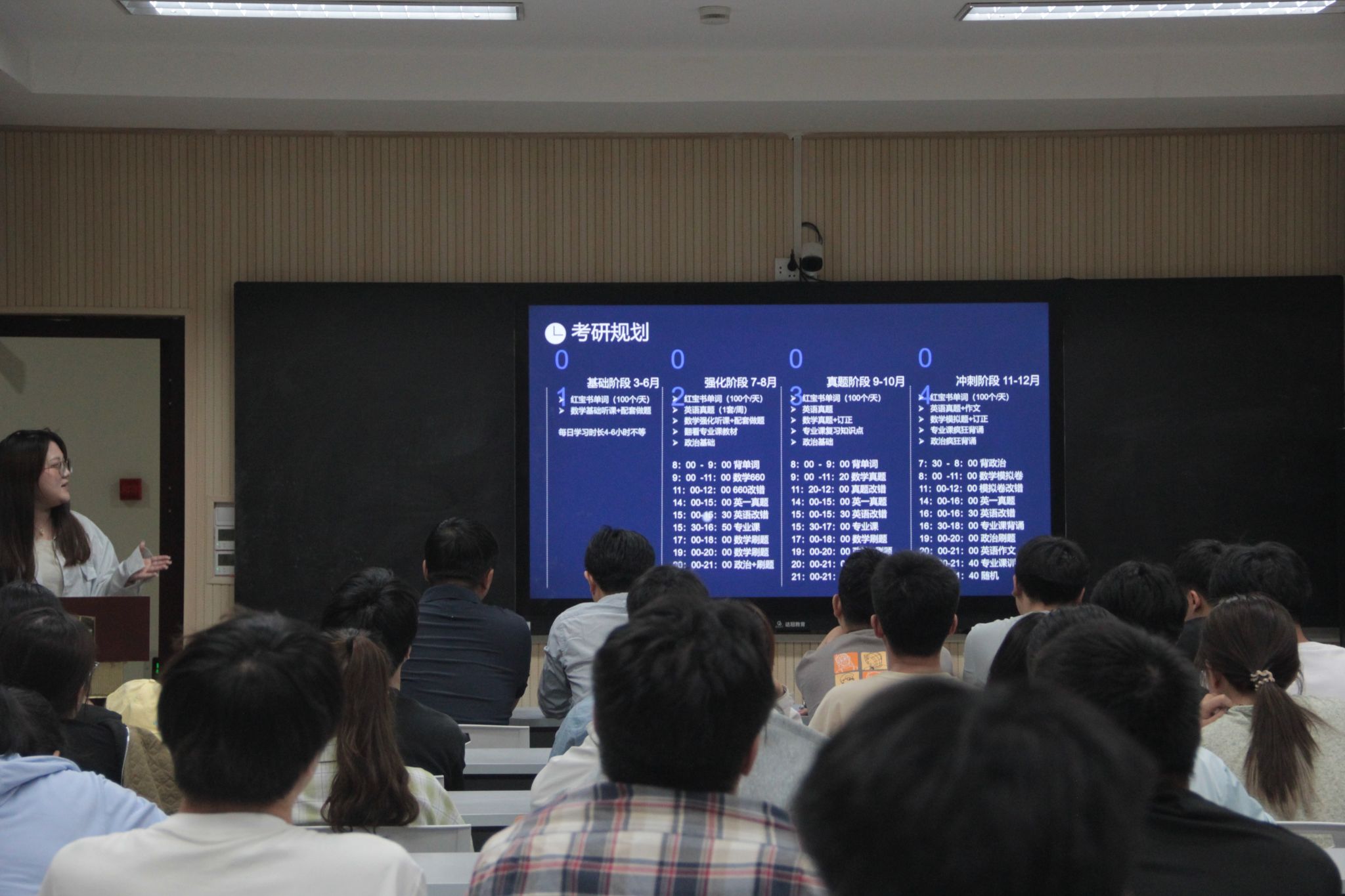 汝昱彤向参会学生详细介绍了保研的时间线和具体流程。他指出,现阶段要积极准备个人资料,为参加夏令营做好充分准备。夏令营结束后,应及时整理个人资料,对所学知识进行查漏补缺,并调整心态,以更好地应对预推免的关键时期;曹紫帆向与会人员展示了自己的考研规划表,并分享了她在不同备考阶段的时间管理与学习安排。在介绍备考经验时,她特别强调英语学习的重要性,尤其是单词的积累。她建议在整个复习期间要反复背诵记忆单词,并总结英语作文的常用句式,形成个性化的作文模板;李亚鹏表示在考研期间,若复习时间不足,要有的放矢,将重心放在基础知识和自己的薄弱点上,有针对性地进行复习;韩冰主要分享了自己各个学科的复习经验,并激励与会学生在备考过程中要保持持之以恒的精神,切勿半途而废。在备考的最后阶段,即便难以维持前期的高强度自律,也要坚持每天抽出两到三个小时复习,以平和的心态迎接考试;常要来基于自身备考经验,向学生们推荐了实用的学习资料和单词软件,并建议大家认真学习相关的网络课程;段园旭则特别强调院校选择的重要性,提醒学生们要充分了解目标院校的要求和特点,选择适合自己的学校。