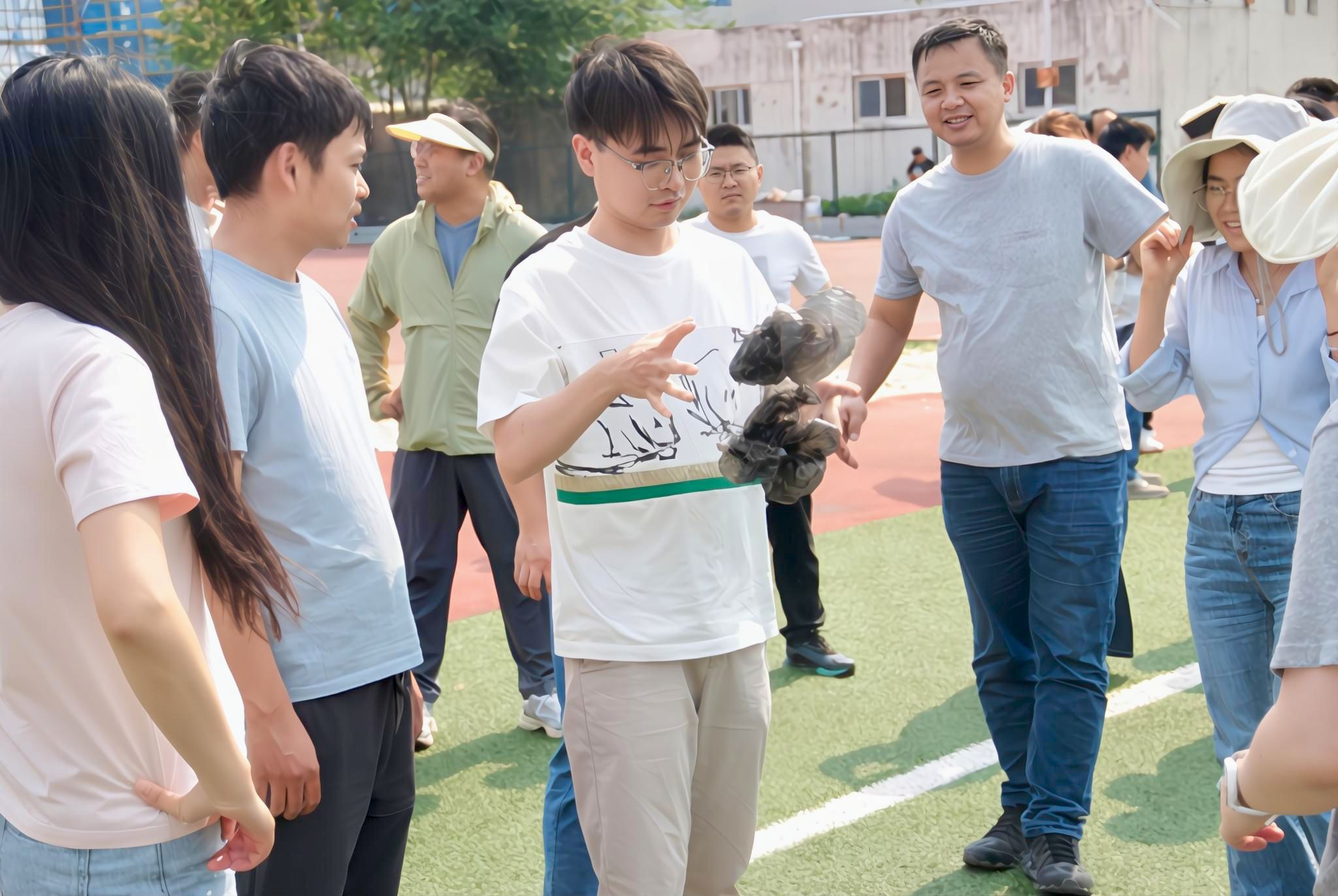 首个比赛项目是“抓塑料袋”,随着裁判一声令下,教师们迅速进入状态,配合默契,动作敏捷,全力以赴争取最佳名次。在“抓住或跑开”项目中,他们反应迅速,策略得当,成功接住沙包与躲避攻击,赢得了场外观众的阵阵欢呼。“一人三板走”项目则更加注重团队协作,各工会小组六人分为一组,接力完成挑战,展现出了出色的平衡能力和协调能力。场外观众的热情被他们的精彩表现所点燃,纷纷为他们加油助威,现场气氛热烈非凡,欢声笑语不断。在“盲眼套圈”项目中,各工会成员被戴上眼罩并在原地旋转五圈,教师们需要依靠自己的直觉和方向感将手中的套圈准确地投向物品区域。整个活动过程中,他们不仅展示了出色的竞技水平,更彰显了团队协作的魅力。最终,“地信”工会小组凭借出色的表现荣获本次趣味运动会第一名。