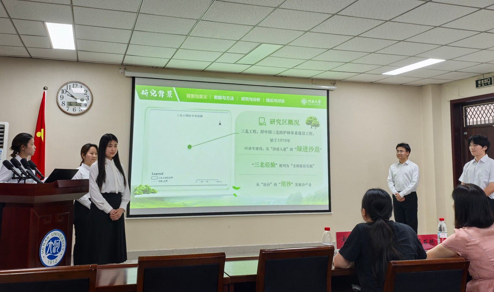 比赛现场,各参赛团队按照前期抽签确定的顺序依次登台进行项目汇报。参赛选手围绕项目的研究背景与意义、数据来源与研究方法、分析过程与研究结果、结论讨论及未来展望等方面进行了详细阐述。参赛项目既有专注于环境变化对生态格局影响的深度研究,也有聚焦人类活动和科学技术对自然环境改造的创新探索。这些项目均运用大量科学数据进行专业分析,研究内容新颖且具有重要的实践价值。在答辩和点评环节,各团队成员思路清晰、应答从容,针对评委提出的项目科学性、研究严谨性等问题给出了专业回应,充分展现了扎实的专业基础和深入的实践思考能力。此外,评委老师还针对汇报时长把控、研究成果可视化呈现,以及项目选题的创新性与落地难度等多个维度进行了专业点评,既充分肯定了各项研究的突出亮点,也客观指出了现有研究中存在的不足之处,并提供了具有针对性的改进建议。