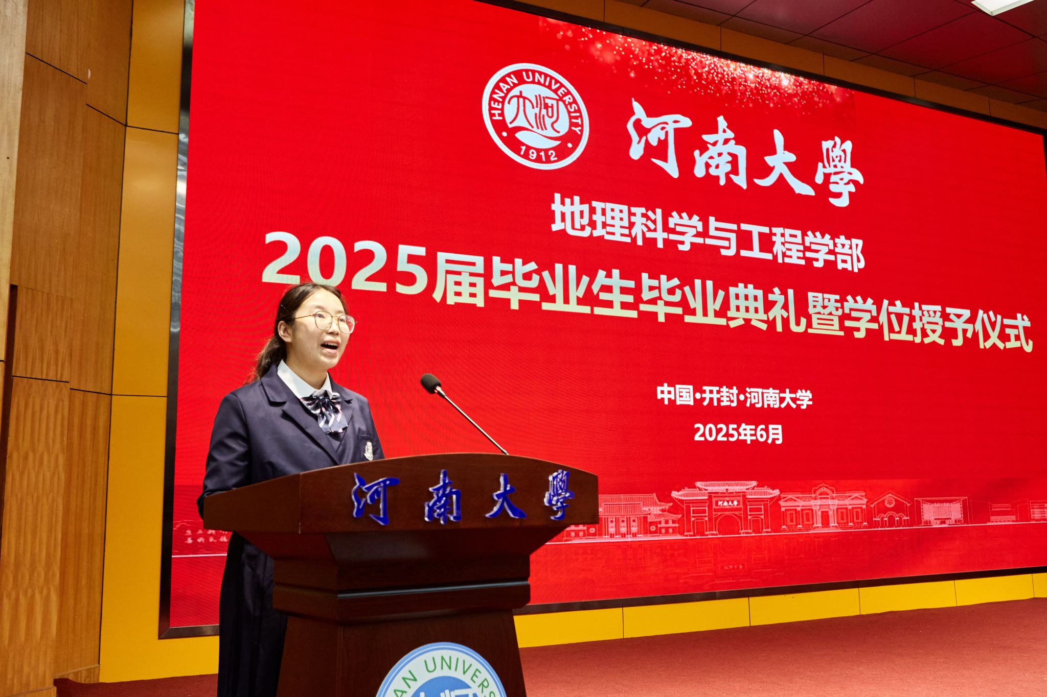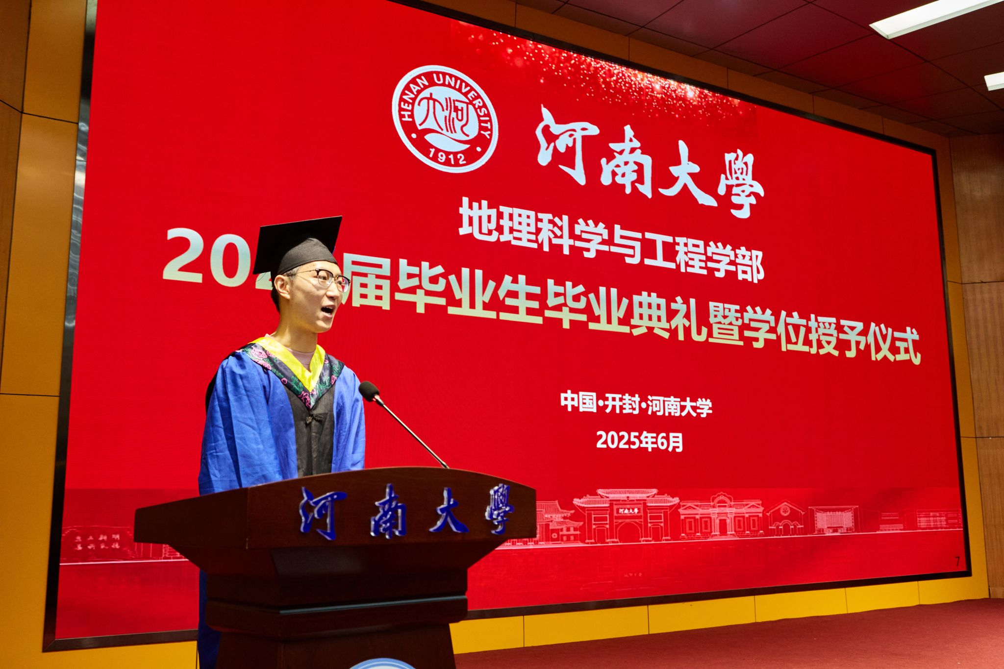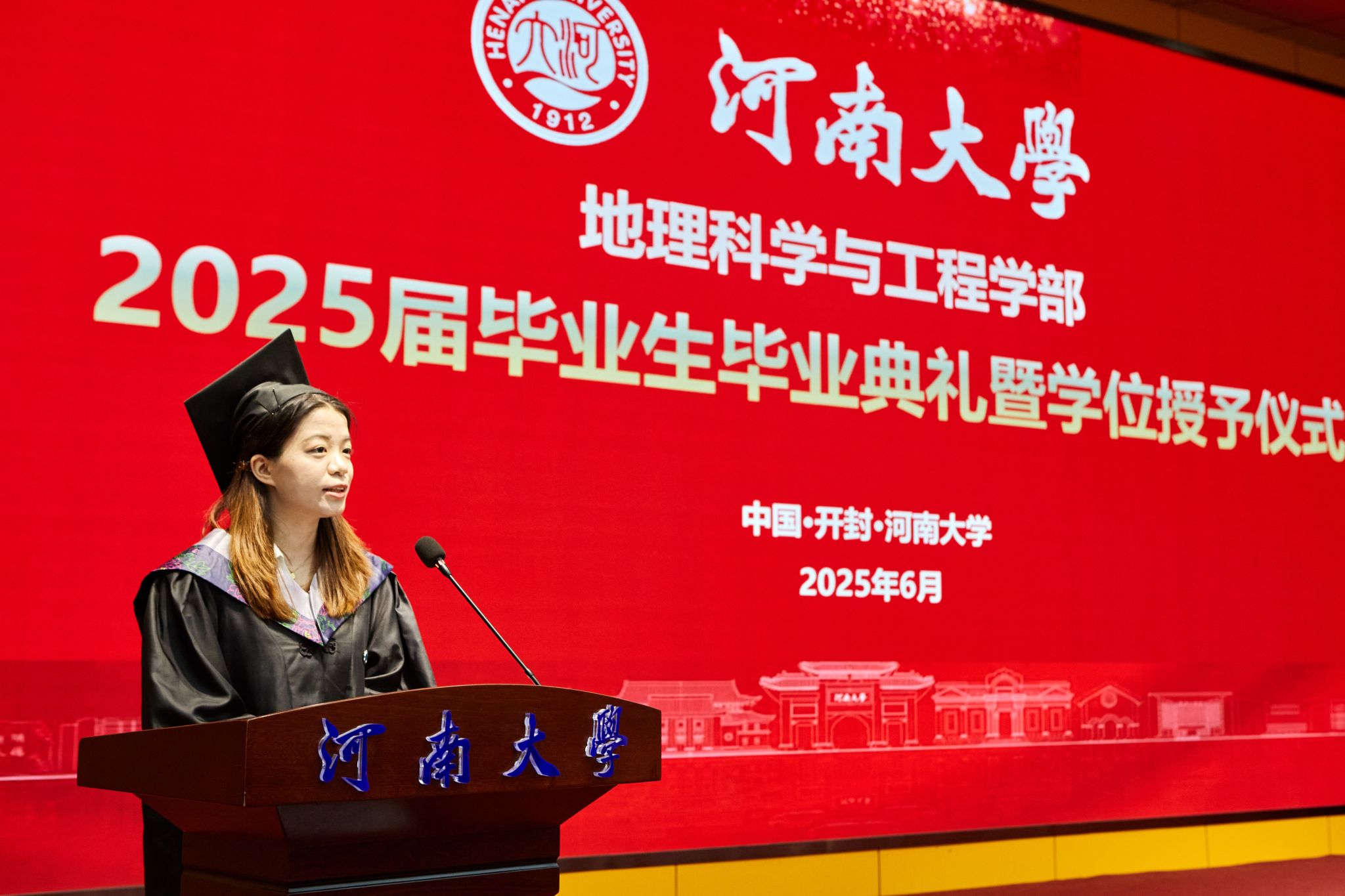 2025届本科毕业生代表王政阳发言。她讲道,无论未来选择深耕学术、奔赴职场还是站上讲台,都将践行“明德新民,止于至善”的校训精神,永远保持地学人的赤诚初心,在各自的人生道路上书写属于自己的华彩篇章。2025届研究生毕业生代表史靓潇发言,他表示心有所信,方能行远;学有所悟,而后笃行。展望未来,毕业生们作为带着地理基因的河大学子,将继续乘风破浪、勇攀高峰。2022级地理科学专业本科生李蓓代表学部在校生向即将离开母校的学长学姐表达了真诚的感谢和祝福,祝愿他们带着地理人的智慧与情怀,奔赴山海,不忘初心,砥砺前行,迈向人生的新篇章。
