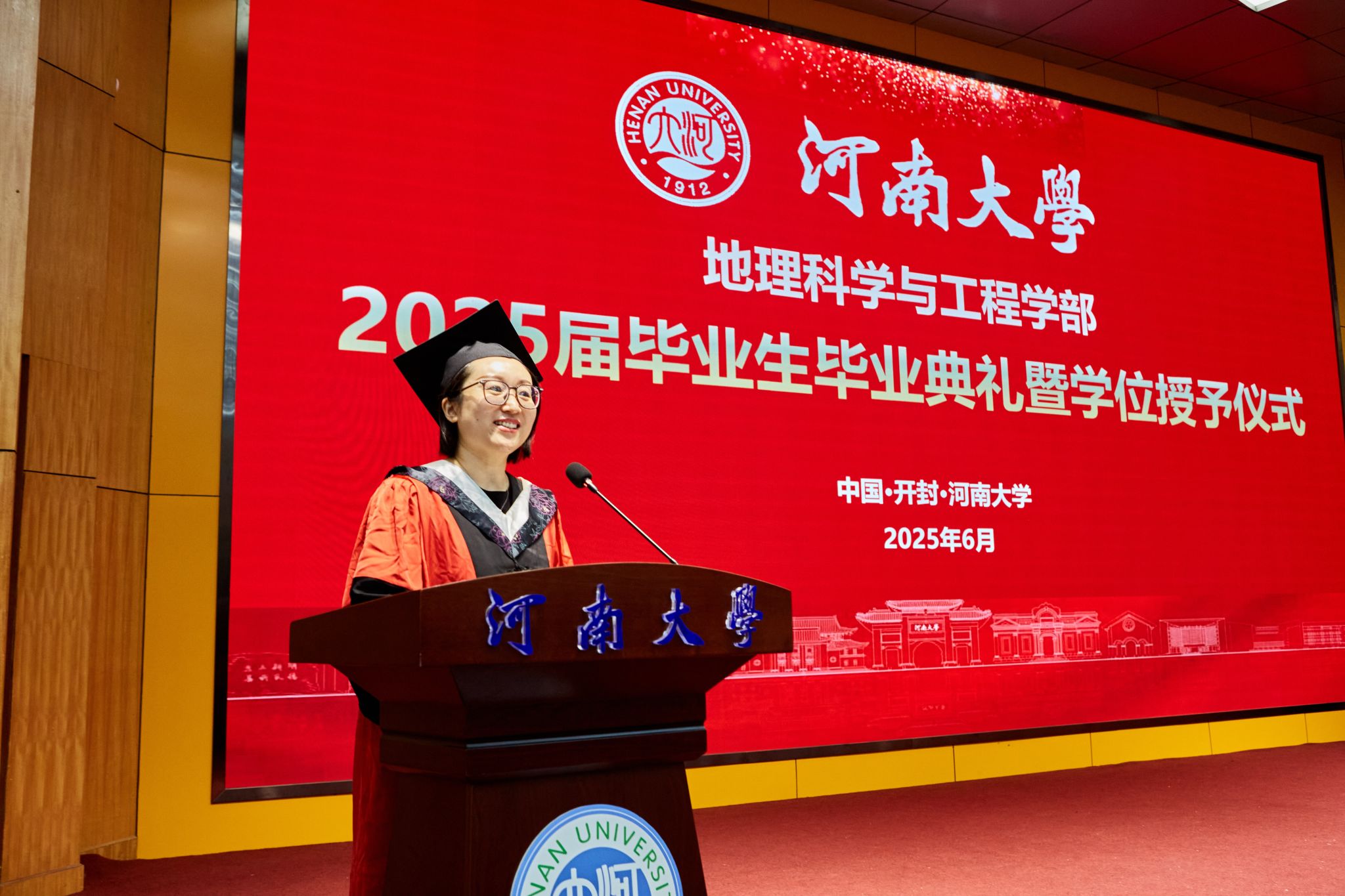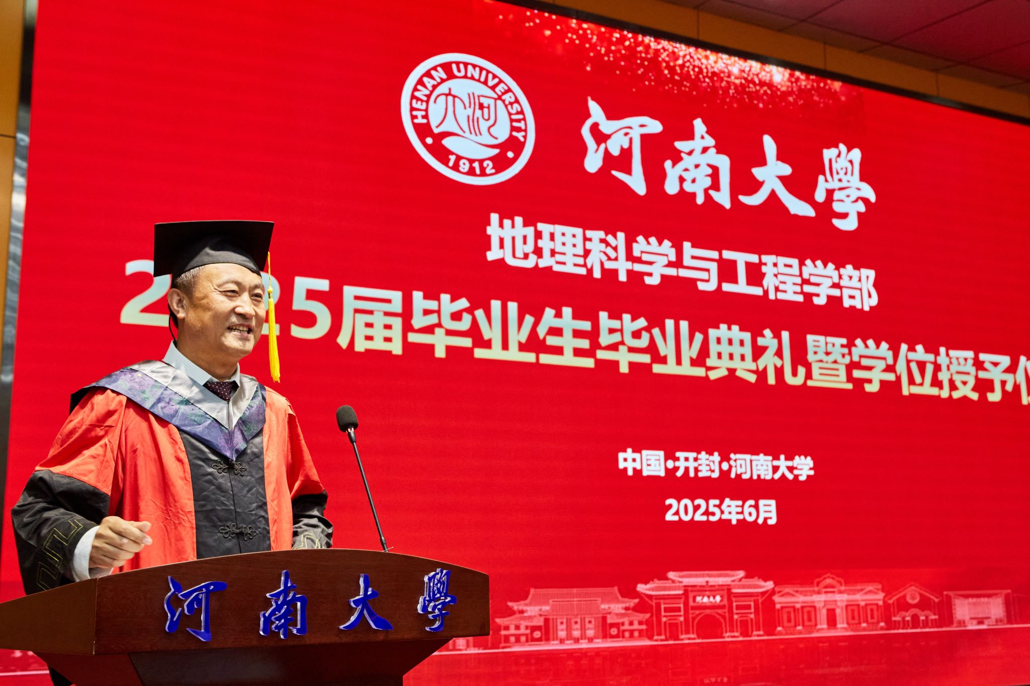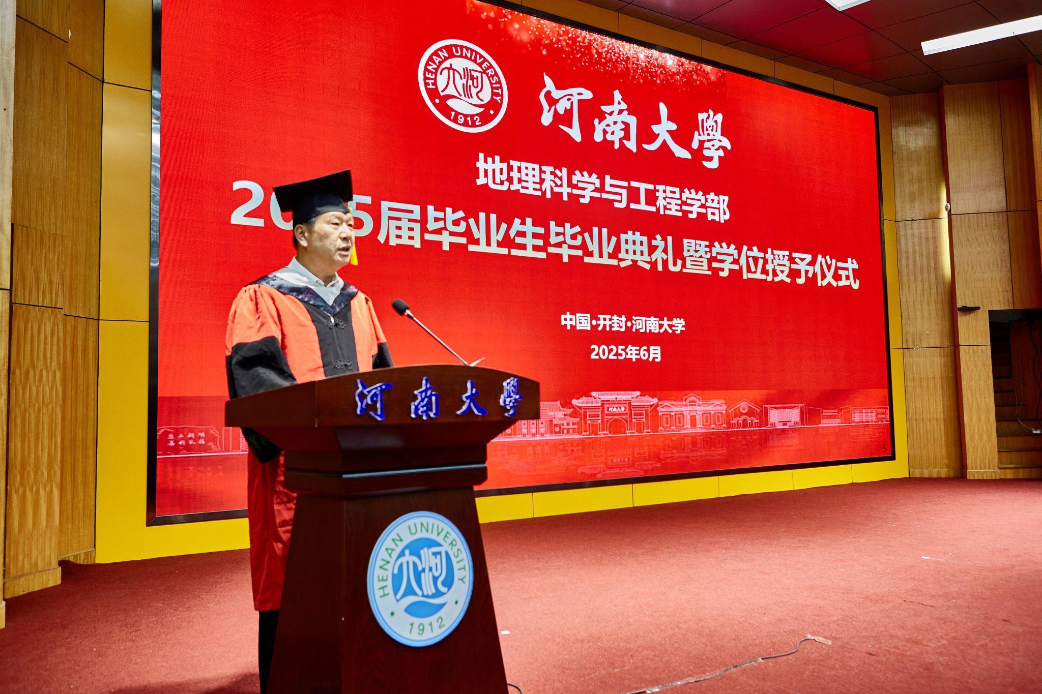 刘彦随向顺利完成学业的全体毕业生致以热烈祝贺,并深情回顾了地理科学与工程学部从初创到发展的奋进历程,介绍了成功共建空间基准全国重点实验室、构建河大地理学“STEP融通创新模式”与“36X地理学科体系”、启动开封凹陷千米钻探工程的可喜进展,阐释了力争新一轮学科评估与一流学科建设实现“双突破”的奋斗目标,以及学部近期推出的本科教学改革“2+2方案”、2025年即将开设的地理科学(林伯襄计划)尖子班和本硕博一体培养的景兰班。在工作回顾中,他高度肯定了毕业生在校期间为学部发展做出的积极付出和取得的优异成绩,也向他们提出四点殷切嘱托:一是铭记地学文脉,筑牢精神根基。以河南大学百年地学人探真理、量山河、报家国的血脉基因锚定人生方向,自觉践行“读万卷书、行万里路、谋万民福”的地理情怀与实践品格;二是传承科学精神,永葆探索热忱。毕业生们应始终秉持科学求实、追求真理、独立思考、大胆创新的科学精神;三是迎接转型挑战,书写事业华章。毕业生们在面对未来挑战时应胸怀经纬、脚踏实地,拥抱变化、终身学习,知行合一、服务社会;四是母校引以为荣,常念河大是家。作为学部的首届毕业生,应积极赋能河大地理学科发展,以奋进与收获做好榜样、奋勇增光。最后,他祝愿学部2025届全体毕业生:“胸怀山河志、脚踏天地宽,初心如磐石、前程似锦繁!”