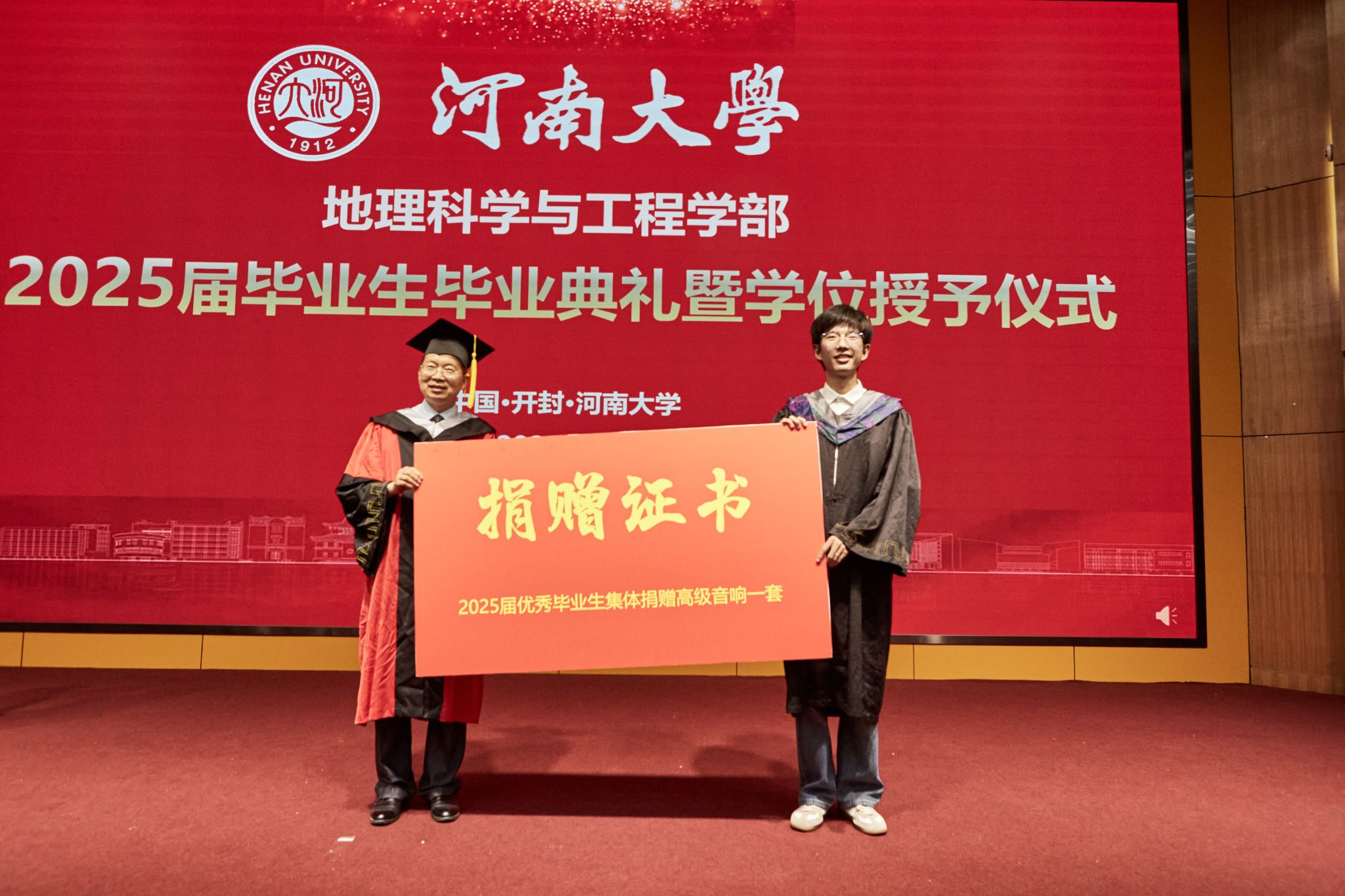 党委书记乔家君代表学部接受本科毕业生捐赠音响设备一套,并向2025届本科毕业生颁发捐赠证书。