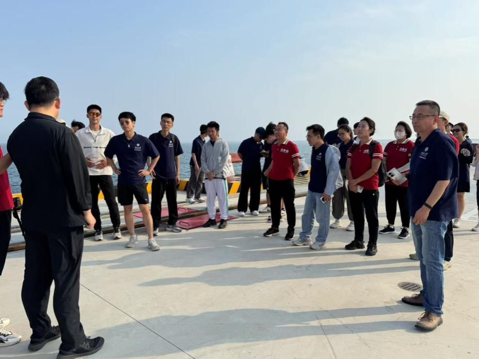 东营港是我国首个在淤泥质海岸大规模人工开挖建设的深水大港;通过围堰吹填等创新工艺,在滩涂上成功开辟出10万吨级航道,攻克了在淤泥质海岸建设深水港的世界性技术难题,其建设经验已被编入港口工程教科书。目前,港区约80%的土地为人工吹填形成,堪称"向大海要来的港口"。站在东营港码头,实习队成员目睹了万吨级货轮有序进出、自动化吊装设备高效作业的场景。碧海蓝天与现代化港区和谐共生,彻底改变了传统印象中港口“灰头土脸”的形象。