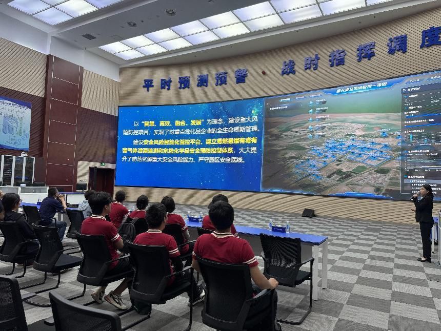 在东营港智慧化工园区,实习队参观了国内领先的园区智慧管理平台。通过大屏幕上实时显示的3D可视化系统,队员们直观了解了该平台如何运用物联网技术、AI算法实现对危化品的全流程动态监控、风险智能预警以及高效应急响应。讲解员介绍,“平台已接入5000多个传感器,事故响应效率提升达70%”,这使实习队成员对数字化技术如何筑牢化工行业安全生产防线有了深刻认知。