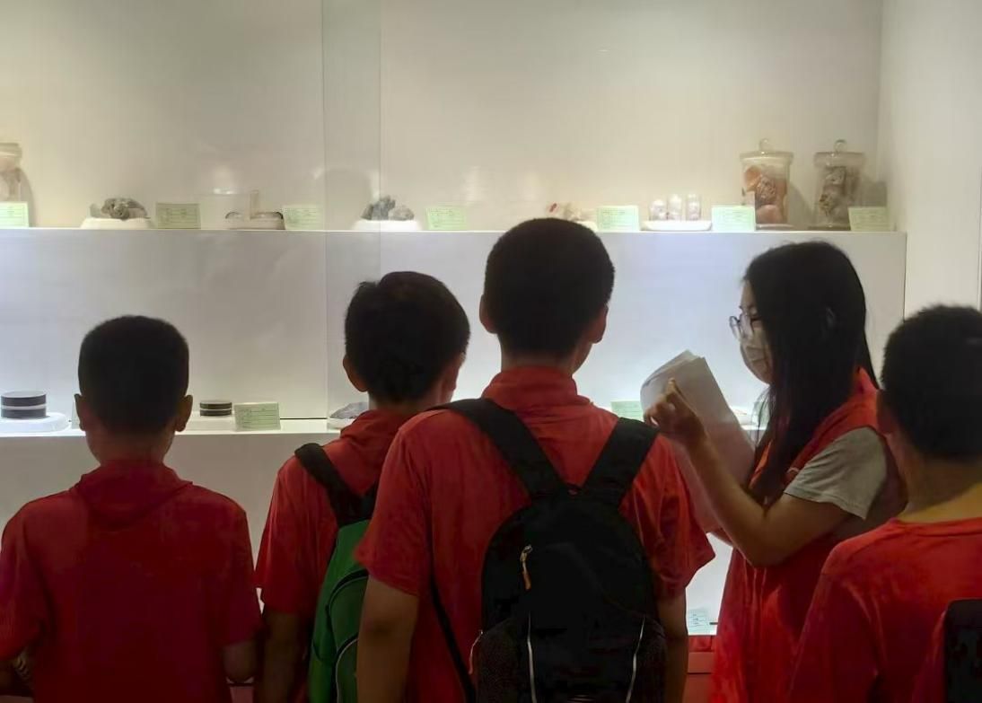 活动当天,东英自然博物馆内讲解有序,氛围热烈。在讲解员的引导下,孩子们依次走进化石、矿物与岩石展区,构建了初步的地学认识框架。在化石展区,远古生物的遗迹吸引了学生们的好奇心。讲解员结合典型标本,系统介绍了化石的形成过程及其在地质研究中的重要意义,激发了学生们探究地球的热情。矿物展区则通过绚丽多样的标本展示,引导学生认识矿物的物理特性与现实用途,增强了对自然资源与人类生活关系的认知。而在岩石展区,讲解员协助组织学生们观察典型岩石样本,配合讲解岩石的分类方法及其形成条件,引导学生进行对比分析,初步掌握岩石的基本分类方法及其构造功能。