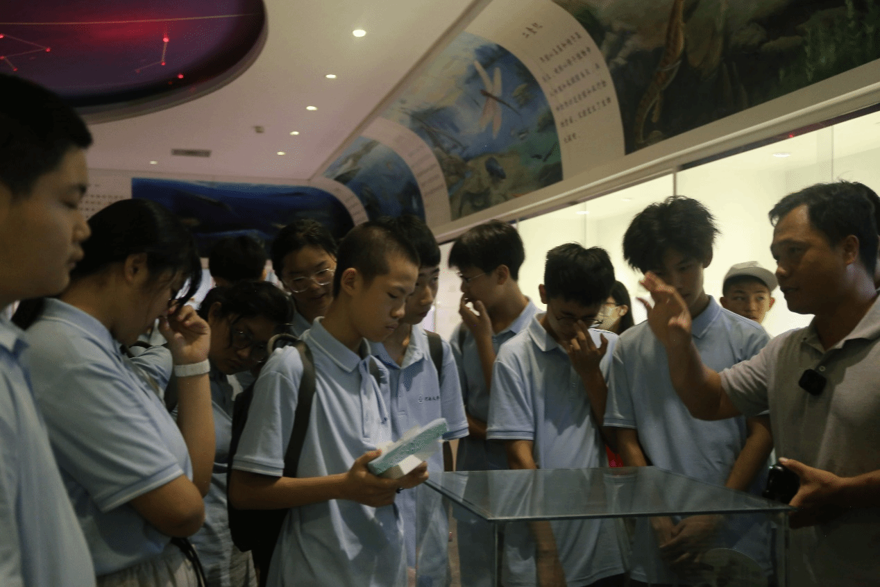 在化石展区,恐龙骨骼、三叶虫印痕等远古遗迹引发同学们浓厚兴趣。讲解老师结合典型标本,系统介绍化石形成过程及其在地质研究中的意义,帮助大家初步建立“时间—生命—地层”的框架。岩石展区,同学们手持花岗岩、砂岩、片麻岩标本,对比观察矿物组成与结构差异,讲解老师细致讲解火成岩、变质岩和沉积岩的形成奥秘,让孩子们对矿物标本的奇特性有了深刻认知。