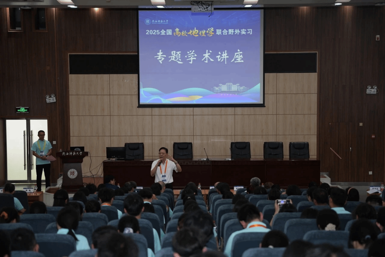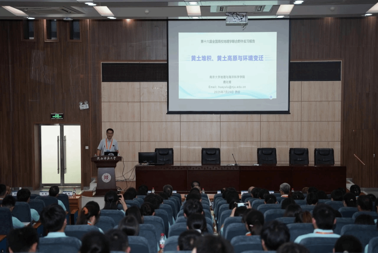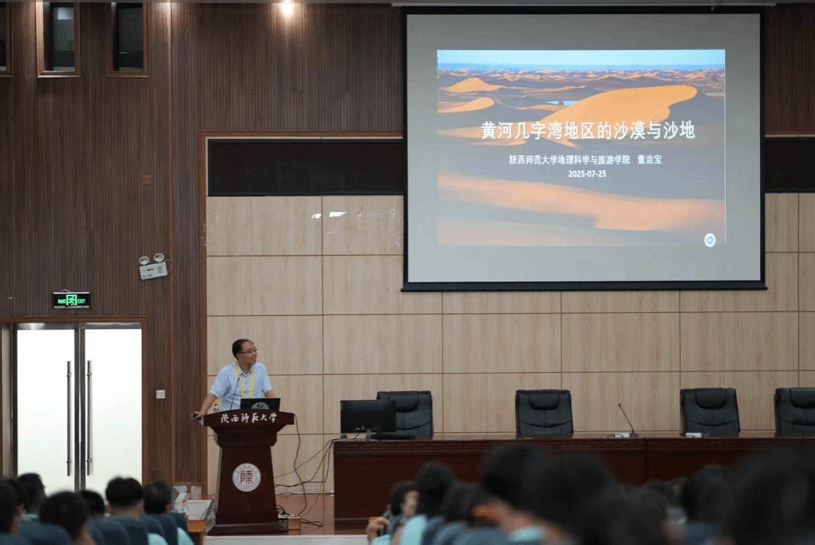 副院长焦磊的主持下,三位教授分享了精彩的报告。南京大学鹿化煜教授以《黄土堆积、黄土高原与环境变迁》为题,剖析黄土与高原环境的奇妙关联;陕西师范大学董治宝教授以《黄河几字弯沙漠与沙地》为题,探寻黄河沿岸沙域奥秘;西北大学宋进喜教授以《黄河流域水-生-人系统协调与可持续发展》为题,洞察流域可持续发展密码。三位教授的报告高屋建瓴,兼具学术深度与实践价值,不仅深度解析了黄土堆积、沙漠演化、人地关系等重要地理问题,也为随后的实习提供了理论指引。