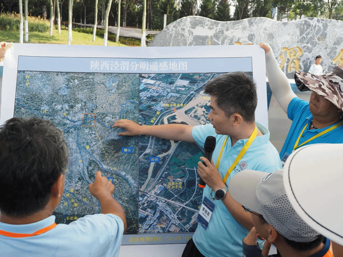 上午9:00,实习队一行来到泾渭分明观景台。“泾渭分明”奇观位于陕西省西安市高陵区。这里是泾河与渭河的交汇处,由于两条河流在流速、泥沙含量及水体密度上存在显著差异,交汇处在一年中不同的时期呈现出不同的交汇状态,并形成了一道清晰的分界线。陕西师范大学李双双老师围绕“泾渭分明”这一现象展开深入讲解,并详细阐释了这一特殊地理现象背后的形成机制,引导学生开展更加深入的探究并从多角度展开思考。