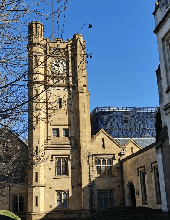 在校园参访过程中,师生们走近了墨尔本大学的标志性建筑——哥特式钟楼。据随行讲解介绍,该钟楼始建于1927年,为纪念在一战中牺牲的墨大学子而建,承载着深厚的历史记忆与校园精神。师生们在钟楼前的草坪驻足观摩,该区域不仅是学生活动的重要场所,也被视为校园文化的核心空间之一。