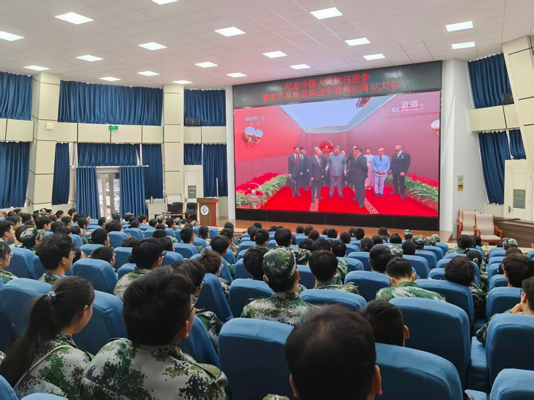 随着激昂的国歌声响起,屏幕中鲜艳的五星红旗在天安门广场冉冉升起,全体师生自觉起立,面向屏幕行注目礼,现场气氛庄严肃穆。礼炮轰鸣中,仪仗队迈着铿锵步伐走过长安街,拉开了阅兵分列式的序幕。本次阅兵编设45个方(梯)队:空中护旗梯队由多型直升机组成;徒步方队体现了“一老一新”的特点;战旗方队承载着浴血奋战的功勋荣誉;装备方队按实战化要求联合编组;空中梯队则采用模块化、体系化编组,参阅武器装备多为首次亮相。从国旗护卫队的庄严敬礼,到抗战老兵的热泪盈眶;从徒步方队的整齐划一,到战略导弹部队的威武亮相,大家都深刻感受到国家的强盛与民族的自豪感。师生们凝神观看,现场不时爆发出热烈掌声。大家被祖国强大的军事实力和国防现代化成就深深震撼,深切感受到新中国来之不易、中国特色社会主义来之不易。