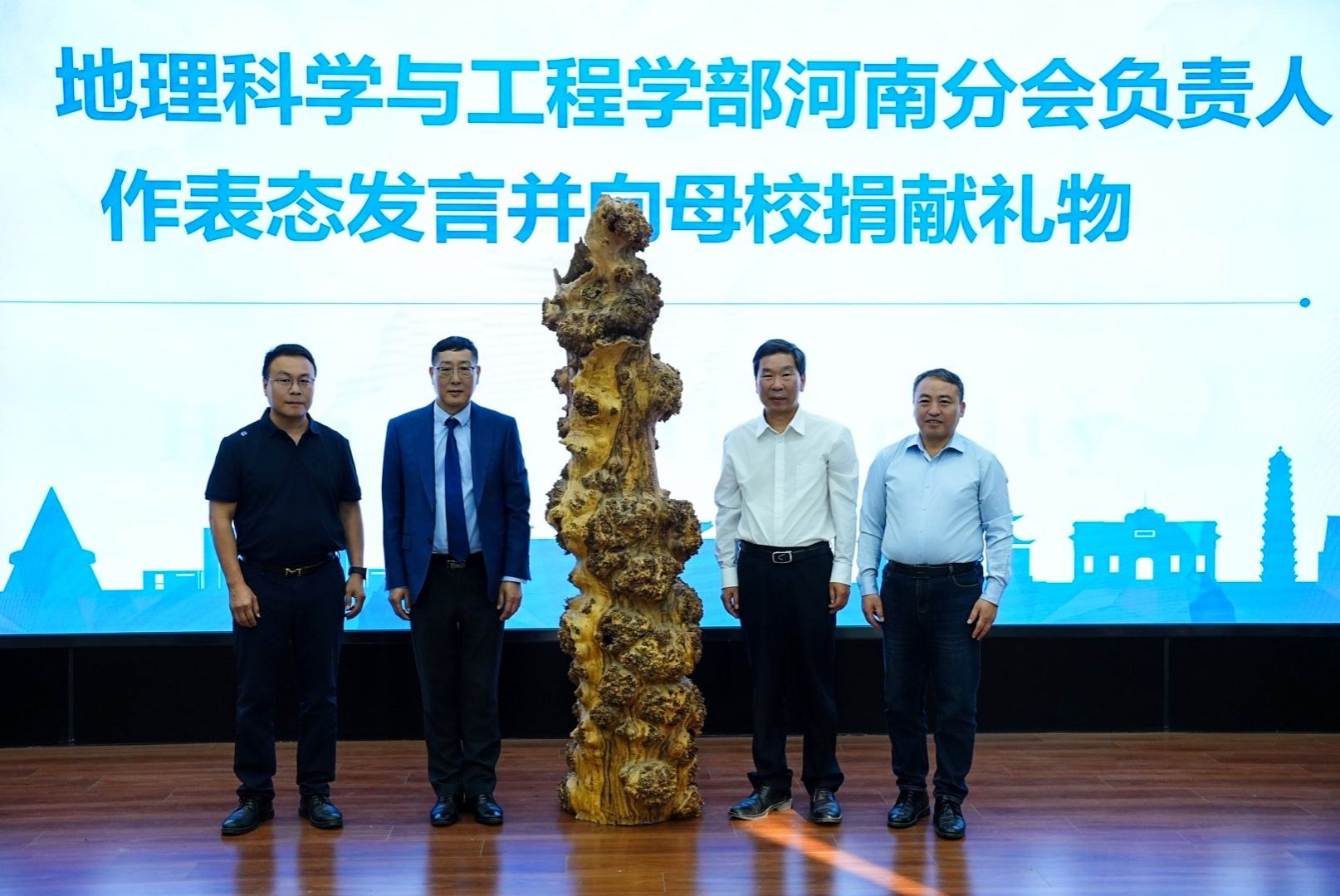 新当选的张占武会长在表态发言中表示,将带领分会做好三项工作:一是成为情感纽带,定期组织活动,延续校友间的深厚情谊;二是搭建事业桥梁,推动校友合作,促进产学研融合,为学部建设和河南发展贡献智慧;三是打造传统窗口,弘扬地理学科精神,助力学科创新和人才培养。发言尾声,张占武代表分会向母校捐赠一棵胡杨树。胡杨树生长环境严酷,生命力顽强,象征着河大地理学科百年坚韧、百折不挠之精神,将陈列于地学楼东英博物馆,用于实践教学,是校友返校“五个一”工程(献一策,做一事,帮一人,讲一课,捐一元)的具体体现,承载着校友对母校的深厚情谊。苗长虹与秦奋代表学部接受捐赠。