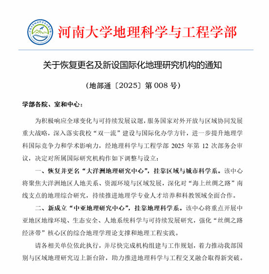 为积极响应全球变化与可持续发展议题,服务国家对外开放与区域协同发展重大战略,深入落实我校“双一流”建设与国际化办学方针,进一步提升地理学科国际竞争力和学术影响力,河南大学地理科学与工程学部决定恢复大洋洲地理研究中心、成立中亚地理研究中心,并于2025年10月23日举行了揭牌仪式。教育部“长江学者”特聘教授、华东师范大学地球科学学部主任、全球创新与发展研究院院长、中国地理学会世界地理研究专业委员会主任杜德斌教授,河南大学学术副校长、地理科学与工程学部主任、发展中国家科球探足球比分