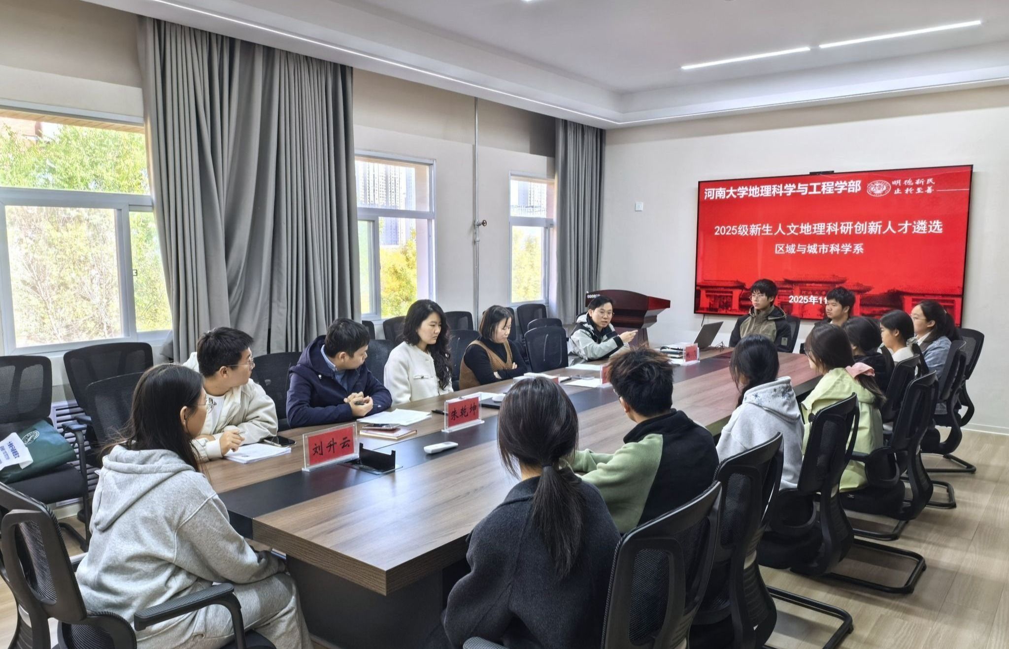 本次遴选活动设置两大核心环节,从“自我展示”到“深度问答”环环相扣、过渡自然。自我展示环节,学生需结合个人学术兴趣、数字工具应用及社会实践经历,系统阐述对人文地理学学科价值与发展前景的认知,以展现自身核心素养与个人发展规划。评委提问环节,评委从兴趣驱动、专业知识、实践技能及综合素养四个维度进行深度问询,全面评估学生的学术潜质与发展能力。整场面试组织有序、氛围严谨而融洽。学生精神饱满、表达流畅,展现出扎实的学科基础、清晰的逻辑思维与良好的科研意识,充分体现出在人文地理学领域的知识积淀与学术热忱。最后,在本次报名的14名学生中遴选出了10名具有敏锐观察力、良好逻辑思维与数据敏感度以及知识融合度较好的学生。