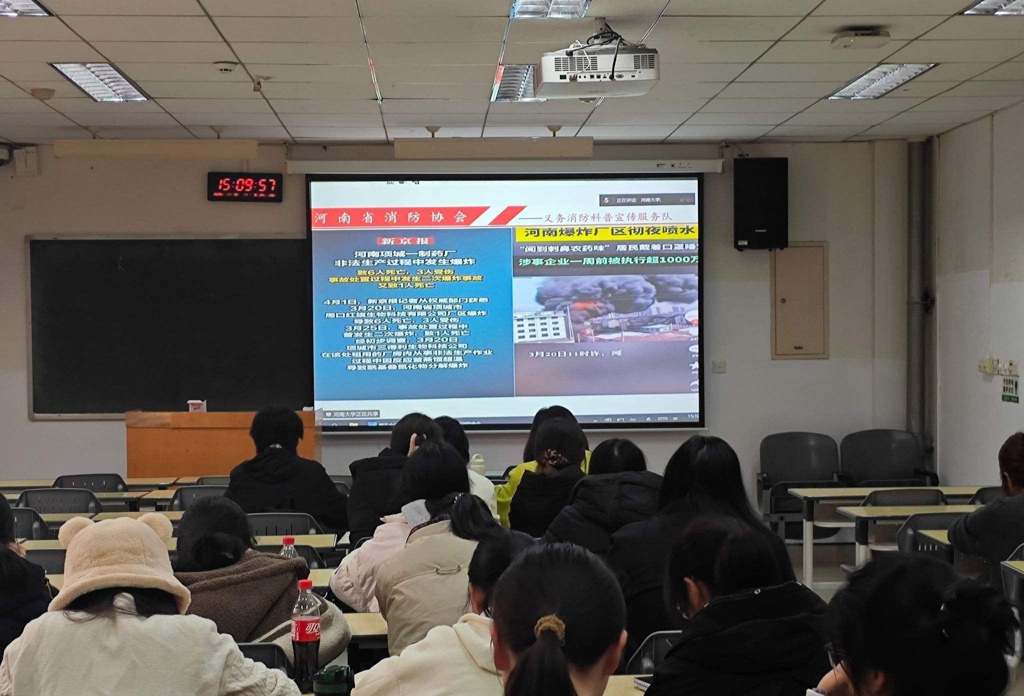 本次讲座由河南省消防协会义务消防科普宣传服务队教员陈艳锋主讲。讲座伊始,陈艳锋以今年多起典型火灾事故为切入点,通过辽宁辽阳饭店爆炸、河北承德养老院火灾、江西新余大火等惨痛事件,深刻揭示消防安全与生命财产安全息息相关,强调“讲安全就是讲素质,抓安全就是抓大事,保安全就是保底线”,点明火灾背后“责任”二字的沉重分量。
