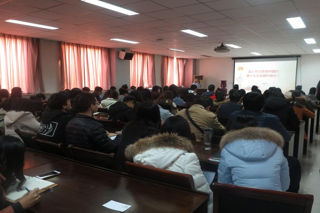 韩晓静老师从“党的十九大的主题和主要成果”“过去五年的历史性成就和历史性变革”“习近平新时代中国特色社会主义思想”“我国社会主要矛盾的变化”等方面进行了贴合生活、深入浅出地解读。其次,就如何深入学习贯彻党的十九大精神,她提出了三点建议:一是原原本本地学习报告内容;二是追本溯源,阅读相关书籍;三是落到实处,融入实践。最后,韩晓静老师还与大家着重分享了习近平总书记对青年一代的寄语,她希望学生党员要注意转换角色,即从“普通学生”向“合格党员”转变,一定要深刻学习报告蕴含的丰富思想内容,深入领会报告作出的重大战略判断,深刻认识报告规划的宏伟目标蓝图,坚定理想信念,志存高远,脚踏实地,努力学习新本领,奋勇投身新时代。