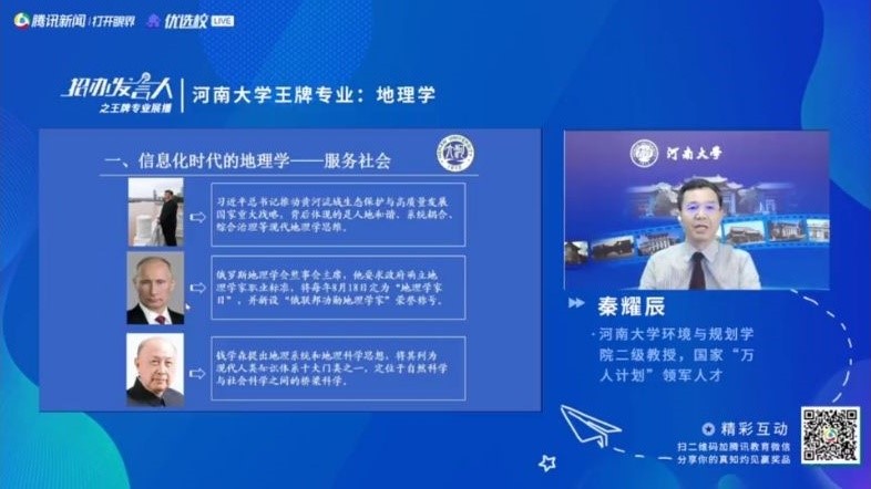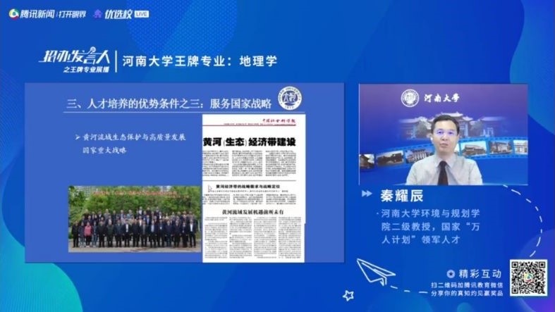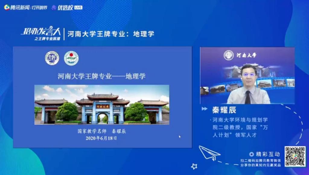 教授秦耀辰在腾讯、新浪直播平台进行王牌专业展播,向应届考生介绍河南大学地理学学科建设情况。