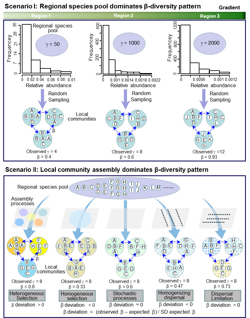 该研究依托我国东部南北森林样带,选择了11个不同纬度带的典型森林生态系统,进行了土壤微生物的高通量测序分析,探讨不同纬度梯度上土壤细菌多样性的变化模式,基于“区域物种库主导”和“局域群落构建过程主导”两种假说,并对两种主导因子影响土壤细菌β多样性分布格局的机制进行了科学论证。研究表明,中国东部南北森林样带上土壤细菌β多样性的变化没有表现出与植物类似的纬度梯度变化规律;不同纬度梯度上的细菌β多样性分布格局主要受局域群落构建过程的影响,而异质性筛选是局域群落构建过程中驱动土壤细菌β多样性地理分布格局形成的最关键影响因子。该研究系统阐明了土壤细菌β多样性的纬度梯度分布格局及其形成机制,研究结果为深入理解微生物生物地理分布格局的形成机制以及辨析不同机制的相对重要性提供了全新的认识视角。