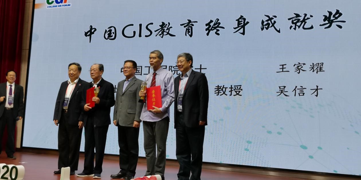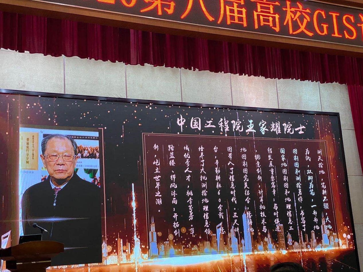 11月7日,2020第八届高校GIS论坛开幕式在广州隆重举行。论坛为“中国GIS教育终身成就奖”“高校GIS创新人物”“高校GIS新锐”“高校GIS新秀”获得者颁奖,其中我校王家耀院士和中国地质大学(武汉)教授吴信才荣获“中国GIS教育终身成就奖”,由中国测绘学会理事长宋超智颁奖并合影留念。随后,王家耀院士作了《中国GIS发展60年》大会主旨报告,结合亲身研究经历讲述了GIS的发展历程,得到与会领导和专家的一致赞同。