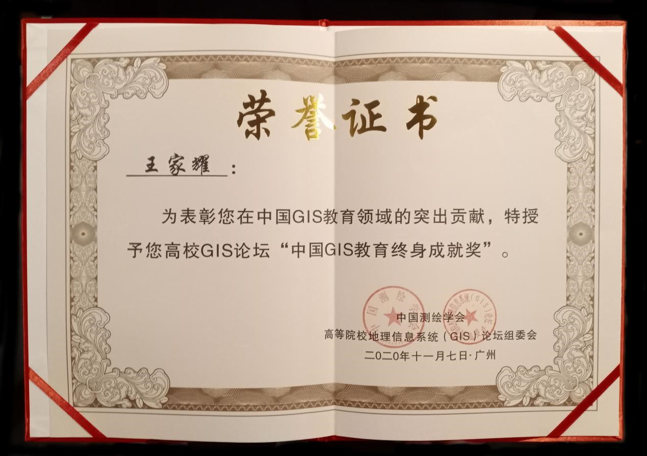 王家耀院士中国GIS教育终身成就奖证书