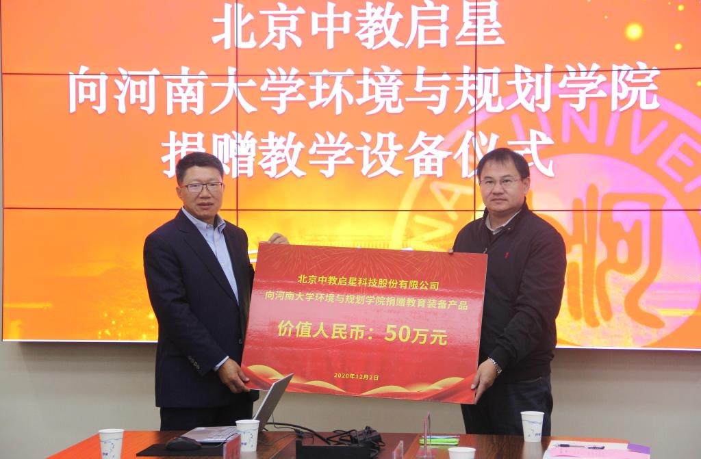 12月2日,北京中教启星向我院捐赠设备仪式在我院三楼研讨厅正式举行。北京中教启星科技股份有限公司总裁王天祥,我院党委书记郑洪涛,执行院长、党委副书记乔家君,党委副书记徐小军,副院长潘少奇,地理科学系教师张广花及捐赠公司部分成员出席捐赠仪式,仪式由徐小军主持。