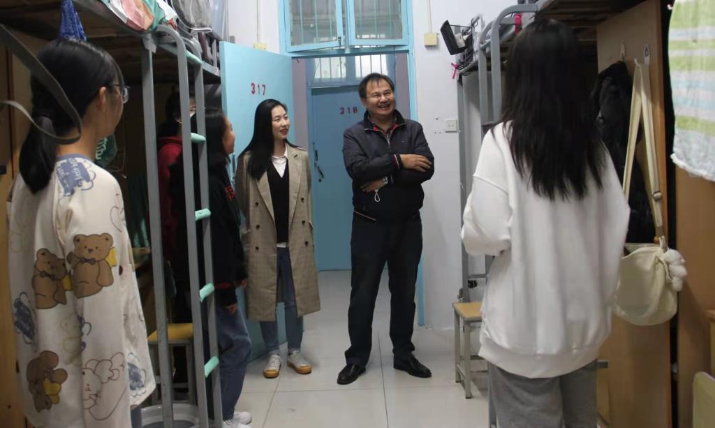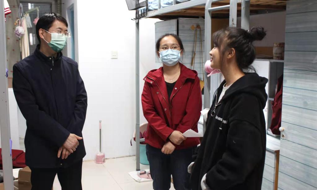 学习生活的基本情况,叮嘱新生做好疫情防控,鼓励大家相互交流、相互帮助,迅速适应新的学校生活,并对同学们寄予厚望,希望大家能够专注学业,树立远大志向,同时积极参加各项活动,享受校园生活。在了解到一名新生和三名其他年级的学生住在一起时,郑洪涛当即联系有关负责人为该生调整宿舍,将她和同年级学生安排在一起。
