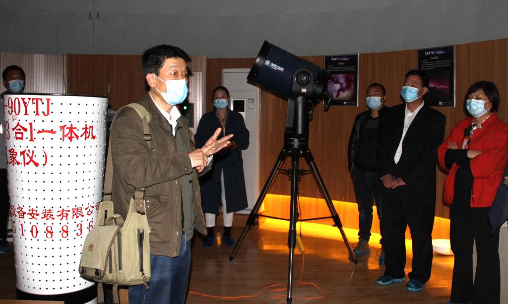 随后,科普团队与学生一起参观观象台,许立民借助天文望远镜等设备为宋城小学教师讲解专业天文知识,分享天文观测经验。他着重阐述了如何在夜空中寻找北极星、如何使用望远镜自动寻星等问题。同时,宋城小学教师带领孩子们探索宇宙,为学生讲述宇宙行星、星云与星座的相关知识。