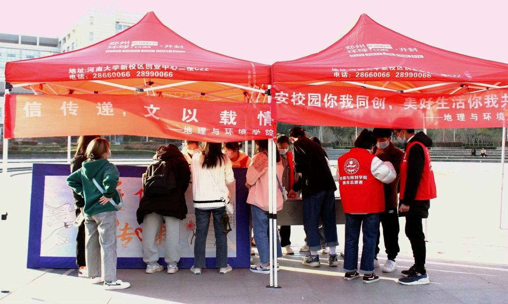 为营造温馨安全的校园氛围,11月11日至13日,我院团委学生会与青年志愿者协会在河南大学金明校区联合举办了爱“信”传递活动。