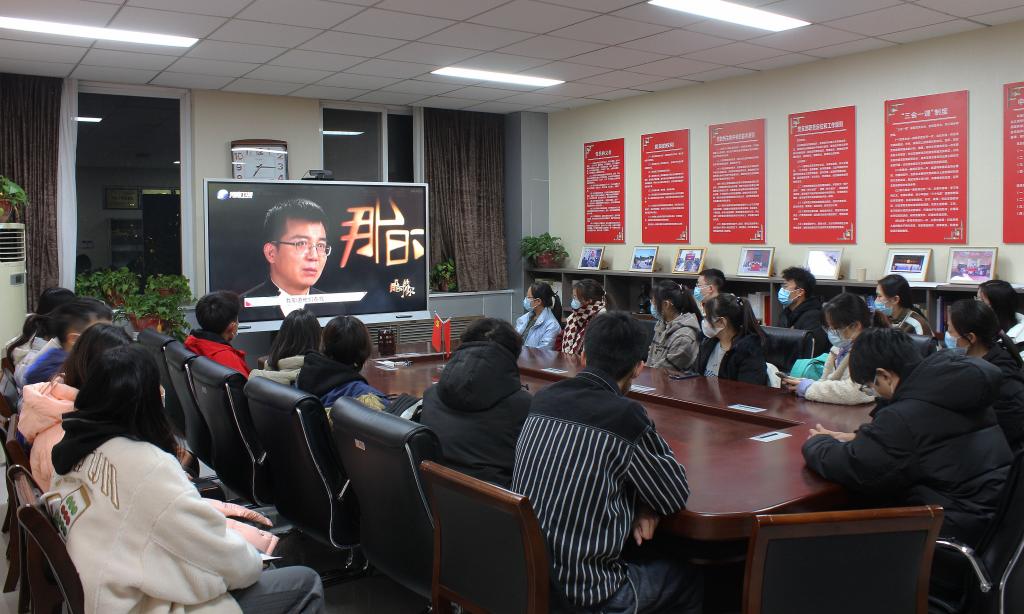 二楼党员活动室观看河南大学与河南广播电视台本月联合推出的大学生红色舞台剧实境记录节目《那时的你》,2021级辅导员屈利铭参与观看活动。