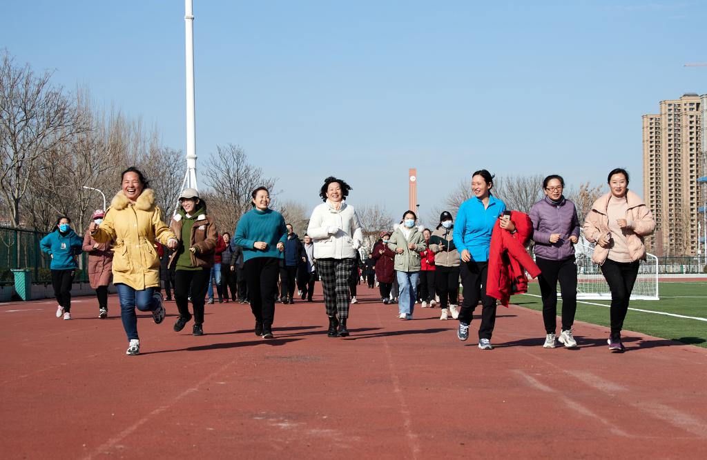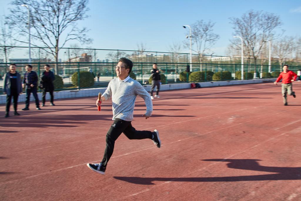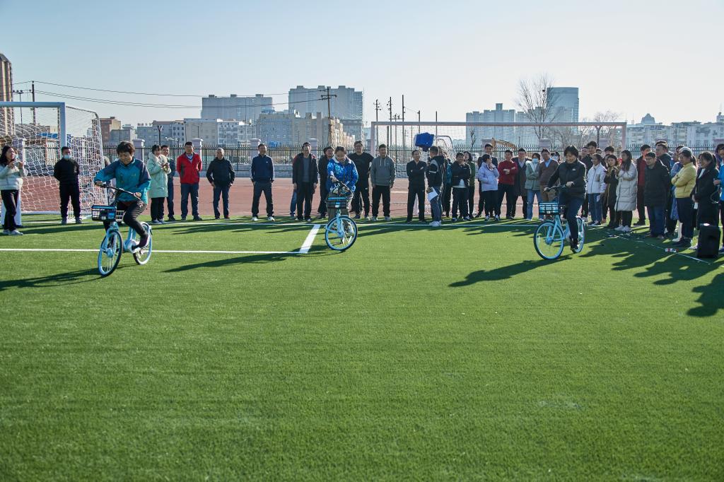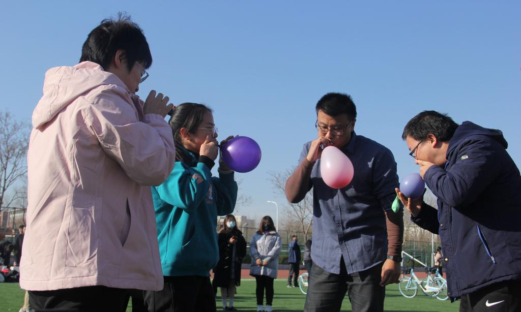 赛前,教职工陆续到场进行热身,他们摩拳擦掌、跃跃欲试。正值寒冬时节,不同于往常的凛冽,暖阳斜洒在操场上,映照出一片欢乐活跃的景象。此次运动会注重趣味与锻炼相结合,分为吹气球、实心球背抛、10米自行车慢骑、点球大战、4×100米接力和50米迎面接力六个项目。