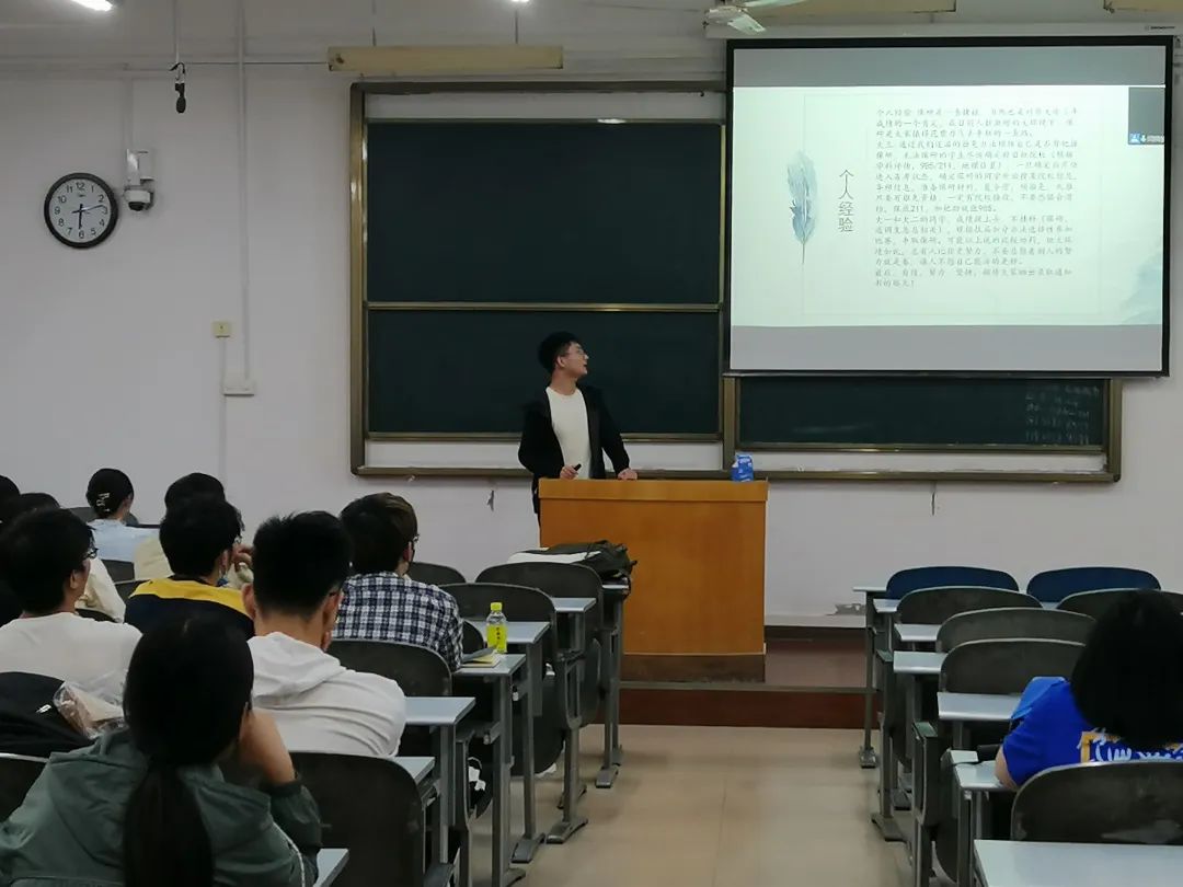 会议伊始,李涛对2018级考研取得优异成绩的学生给予了肯定和祝贺,鼓励2019级学生继续努力,找寻并实现自己的目标。会上,各个分享者以诙谐幽默的讲话风格结合自身考研经历,围绕如何制定考研复习计划、考研和备考心态的保持与调整、考研后的其余事项等方面与在场学生进行了分享交流。他们表示,要明确自身实力,不要盲目从众,做好学习规划,调整好自身心态,积极备考;时刻关注网站发布的信息,及时地了解相关学校的基本情况。