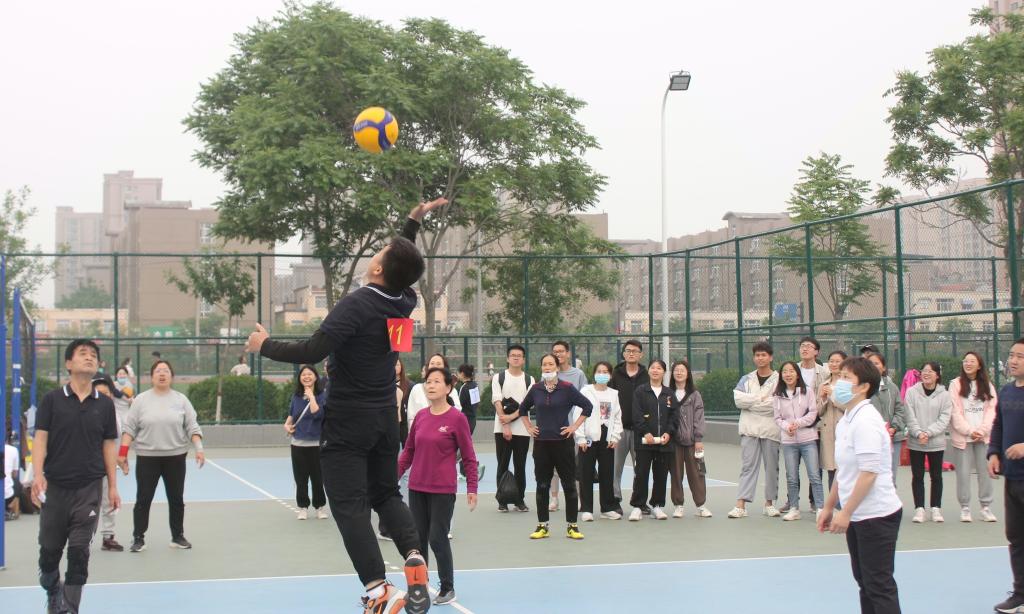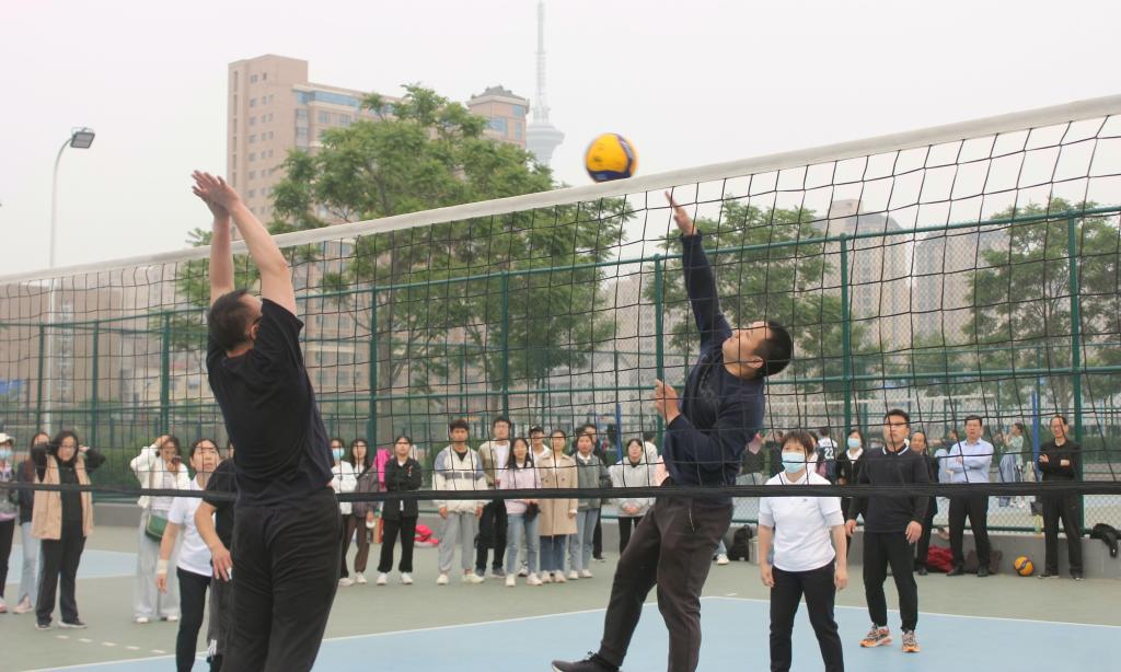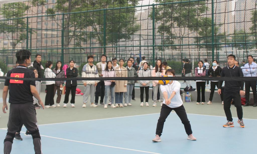 。比赛刚开始,对方连续得分,我方1:4暂时落后。紧接着,垫球、二传、起跳扣杀,我方连追六球、越战越勇,在观众的喝彩声中,我方以25:15的比分拿下第一局。比赛第二局,对方基于第一局的经验制定战术,双方你来我往,竞争激烈,我院队员抓住时机,用一记精准凶猛的快球将比分定格在了25:19。