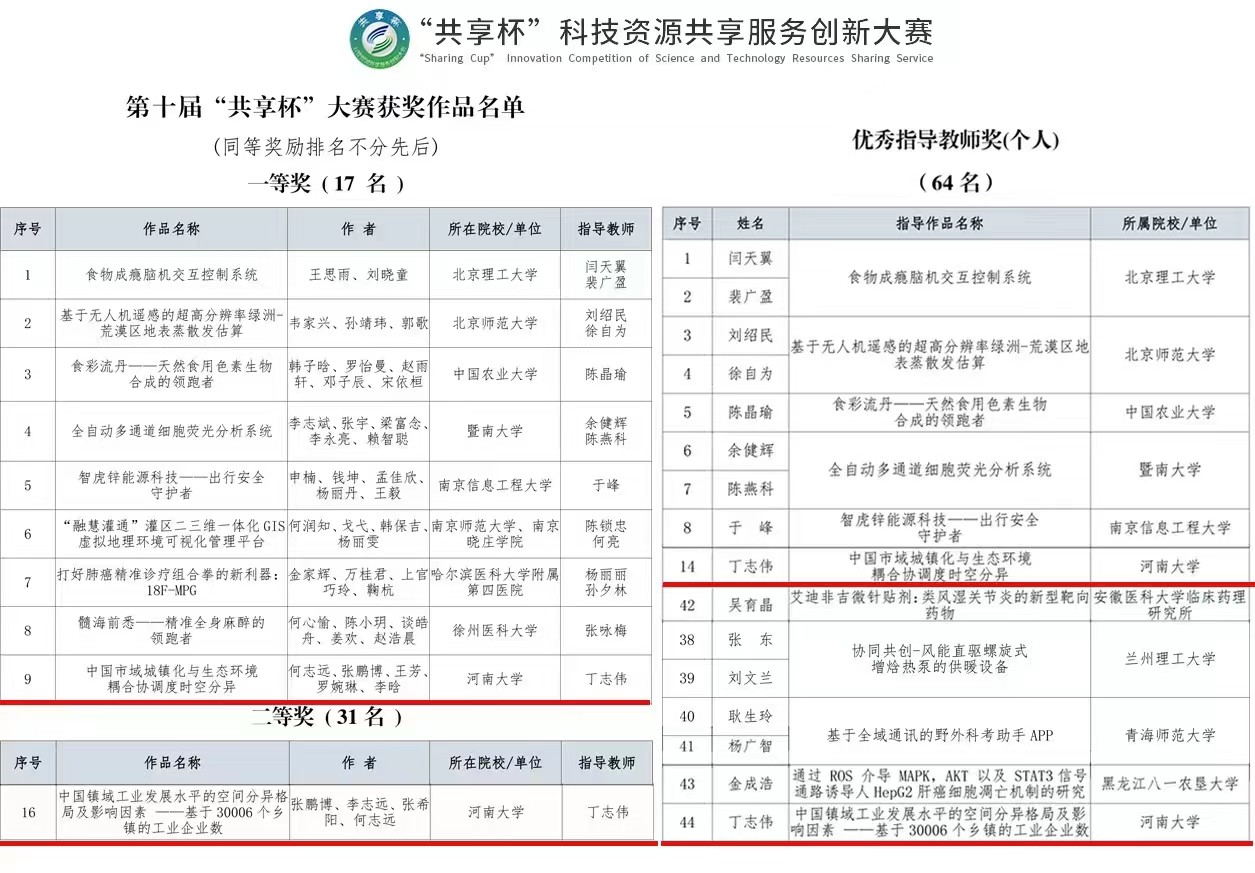 本次大赛历时七个多月,共有北京师范大学、北京理工大学、中国农业大学等国内多所知名高校的在校大学生、研究生参与。我校国家地球系统科学数据中心黄河中下游分中心积极宣传和组织,鼓励本科生、研究生多支队伍参赛。其中,由土木水利、人文地理专业的何志远、张鹏博、王芳、罗婉琳、李晗组成的研究生团队,在丁志伟老师指导下,对两山理论引领下人地耦合系统协调状态进行评价,结合大赛主办单位提供的相关科技基础条件共享平台资源最终确定选题。经过数月的努力,该团队充分发挥我校地理学科优势,应用耦合协调度模型、空间分析技术等进行市域尺度下人-地耦合关系的测度和评价,得出具有科学性、创新性、前瞻性的观点,形成了科技论文《中国市域城镇化与生态环境耦合协调度时空分异》,获得全国一等奖,丁志伟老师荣获优秀指导教师。此外,由张鹏博、李志远、张希阳、何志远组成的研究生团队提交的作品《中国镇域工业发展水平的空间分异格局及影响因素——基于30006个乡镇的工业企业数》荣获全国二等奖。