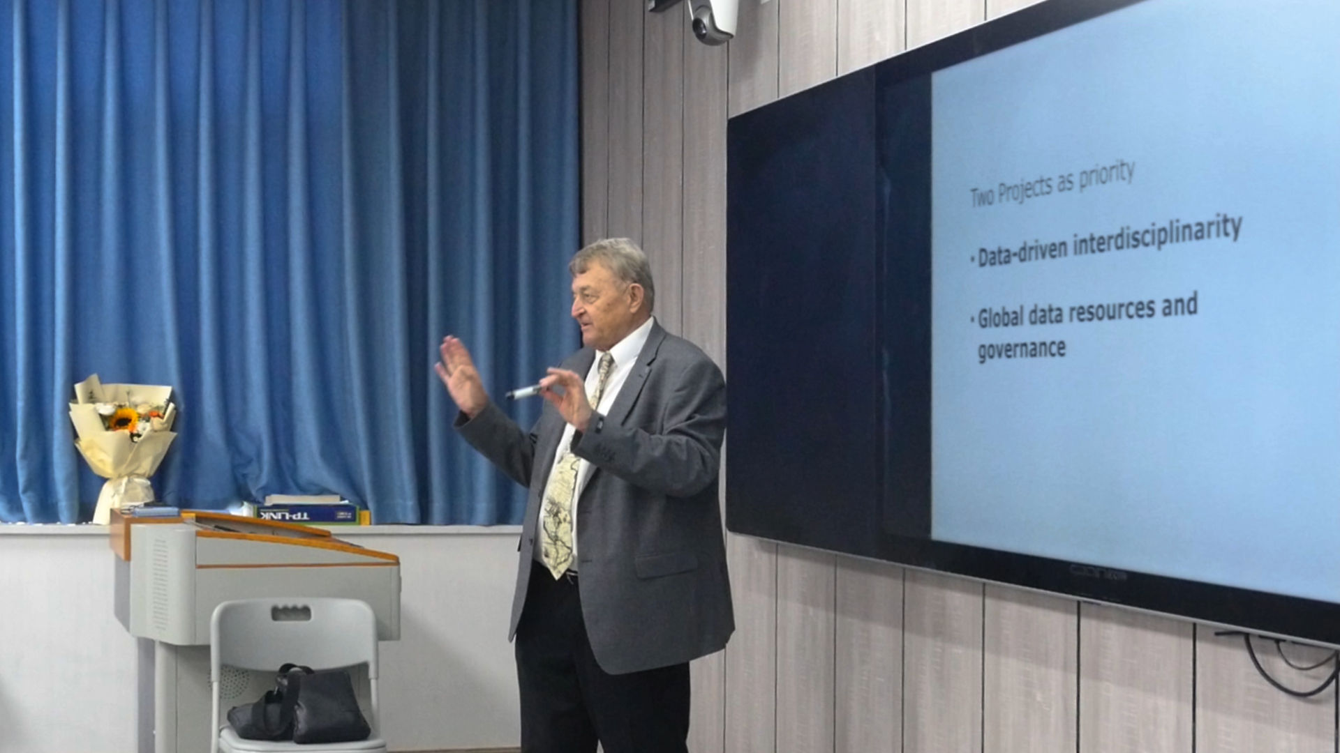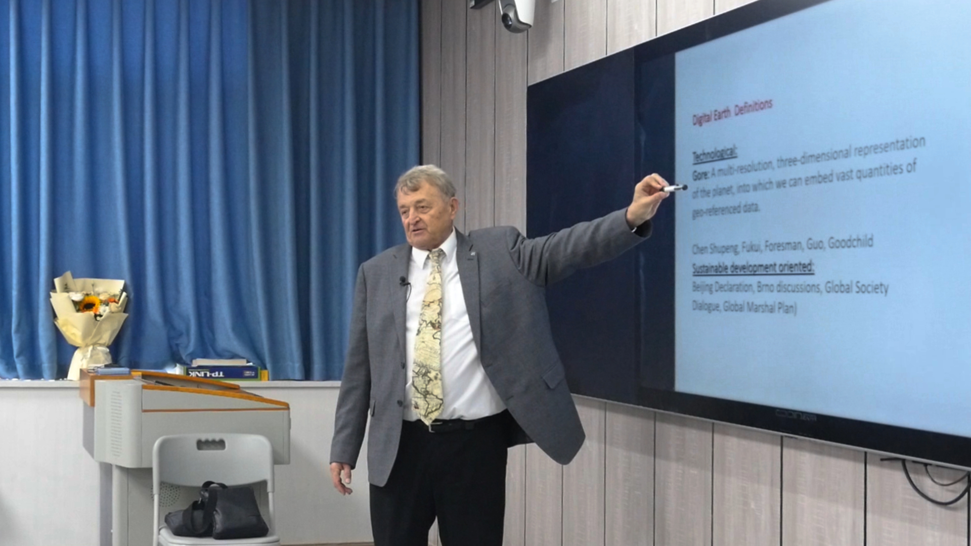 对其来访表示热烈欢迎。Milan Konečný院士的报告主要围绕“城市风险治理的世界性框架”、“城市灾害风险”、“空间数据支持”、“灾害实例”以及“大数据时代的发展潜力及挑战”等主题展开。在城市风险治理的世界性框架方面,Milan Konečný院士首先介绍了2015年联合国可持续发展峰会通过的“2030年可持续发展议程”,详细阐释了17项可持续发展目标及其指标构成,特别强调了SDG 11(Sustainable Development Goal 11)对城市发展的重要性;其次,Milan Konečný院士介绍了联合国减灾战略工作的又一重要组成部分——减少灾害风险议程(DRR),从整体框架、具体目标、指标实施细节三方面阐述了城市风险的治理方式以及联合国愿景下的城市风险治理图景。并借此引出在数据需求新时代中空间数据基础设施、联合国全球地理空间信息管理和其他大数据发挥的重要作用。随后,通过对日本“311海啸”和美国“卡特琳娜飓风”以及雪崩现象三个经典实例的分析,强调了灾害风险治理需要合理的框架与成熟的治理技术。最后,Milan Konečný院士阐释了大数据时代的研究理念与发展潜力,指出将城市风险治理融入智慧城市建设与数字孪生技术发展之中是未来的主要挑战。