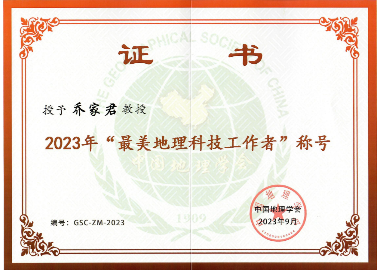 2023年9月27—28日,中国地理学会在天津师范大学举行2023年中国地理学会会员日大会,共同庆祝中国地理学会成立114周年,并隆重表彰2023年度对中国地理学发展做出重要贡献的科技工作者,我院乔家君教授荣获该项殊荣。该项奖励由中国地理学会所属分支机构、各省(直辖市、自治区)地理学会推荐,以及“最美地理科技工作者”评选专家组评审,中国地理学会十二届常务理事会议审议批准。在全国300多家地理高校、机构中进行遴选,共有10位地理学者获此荣誉。