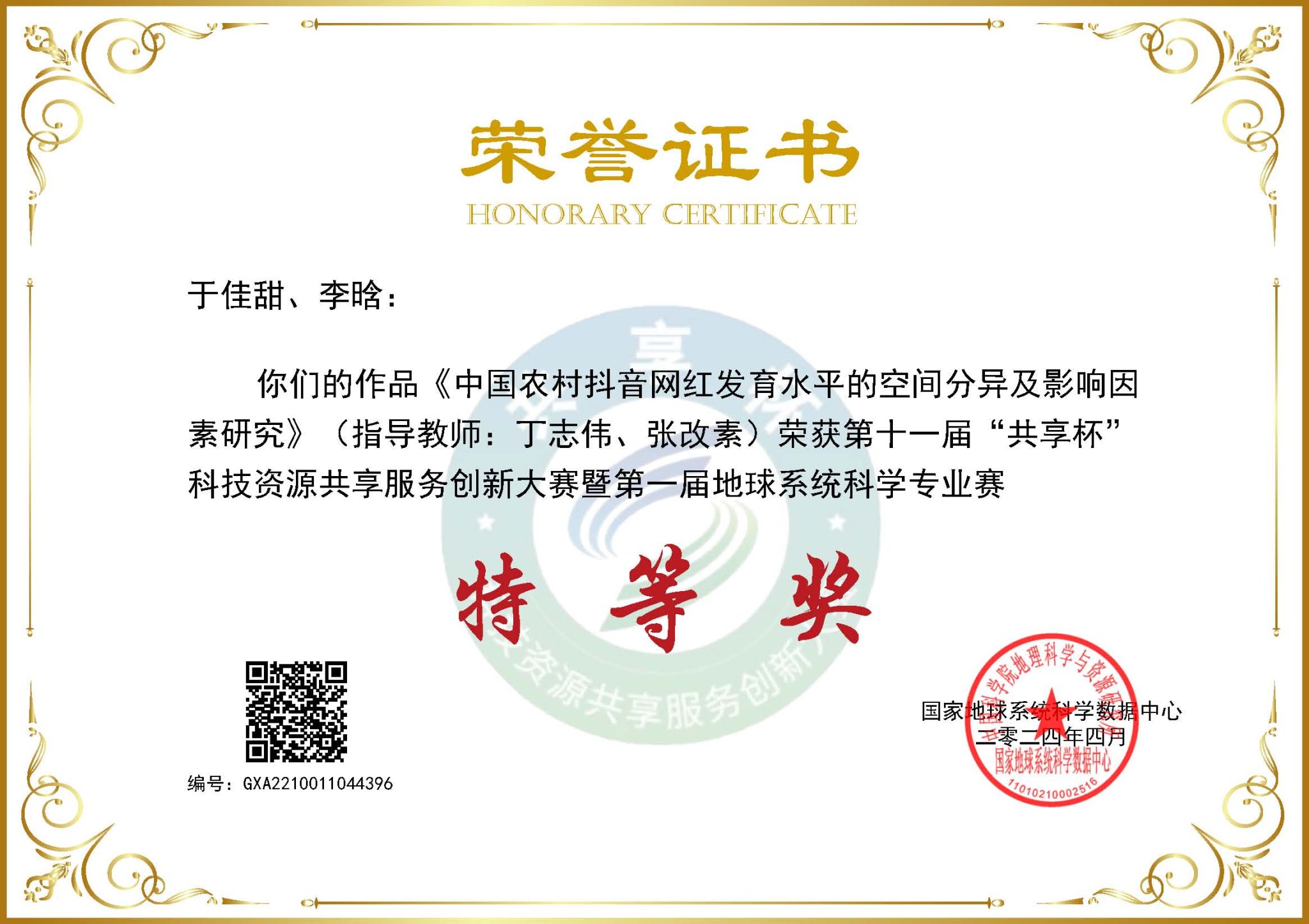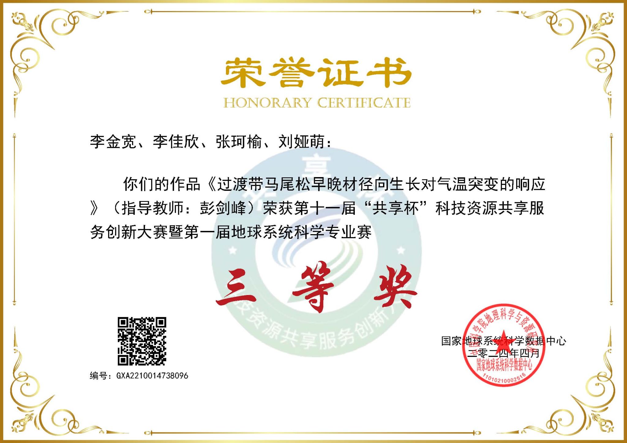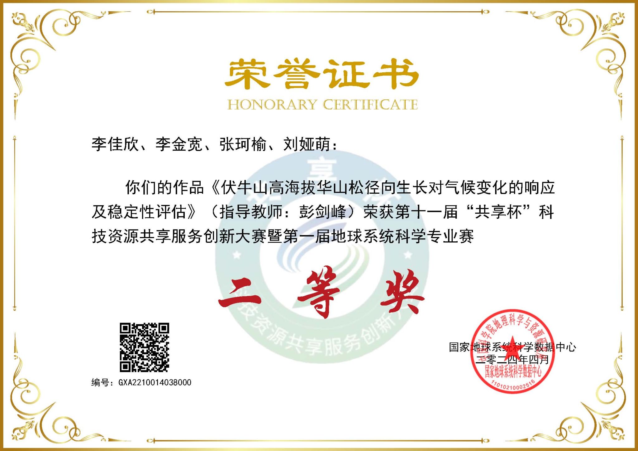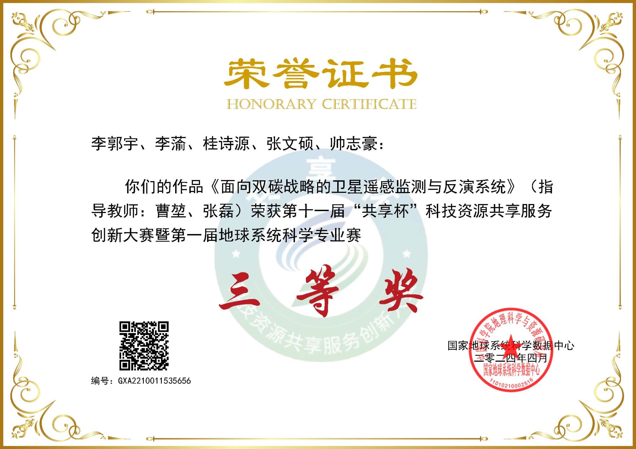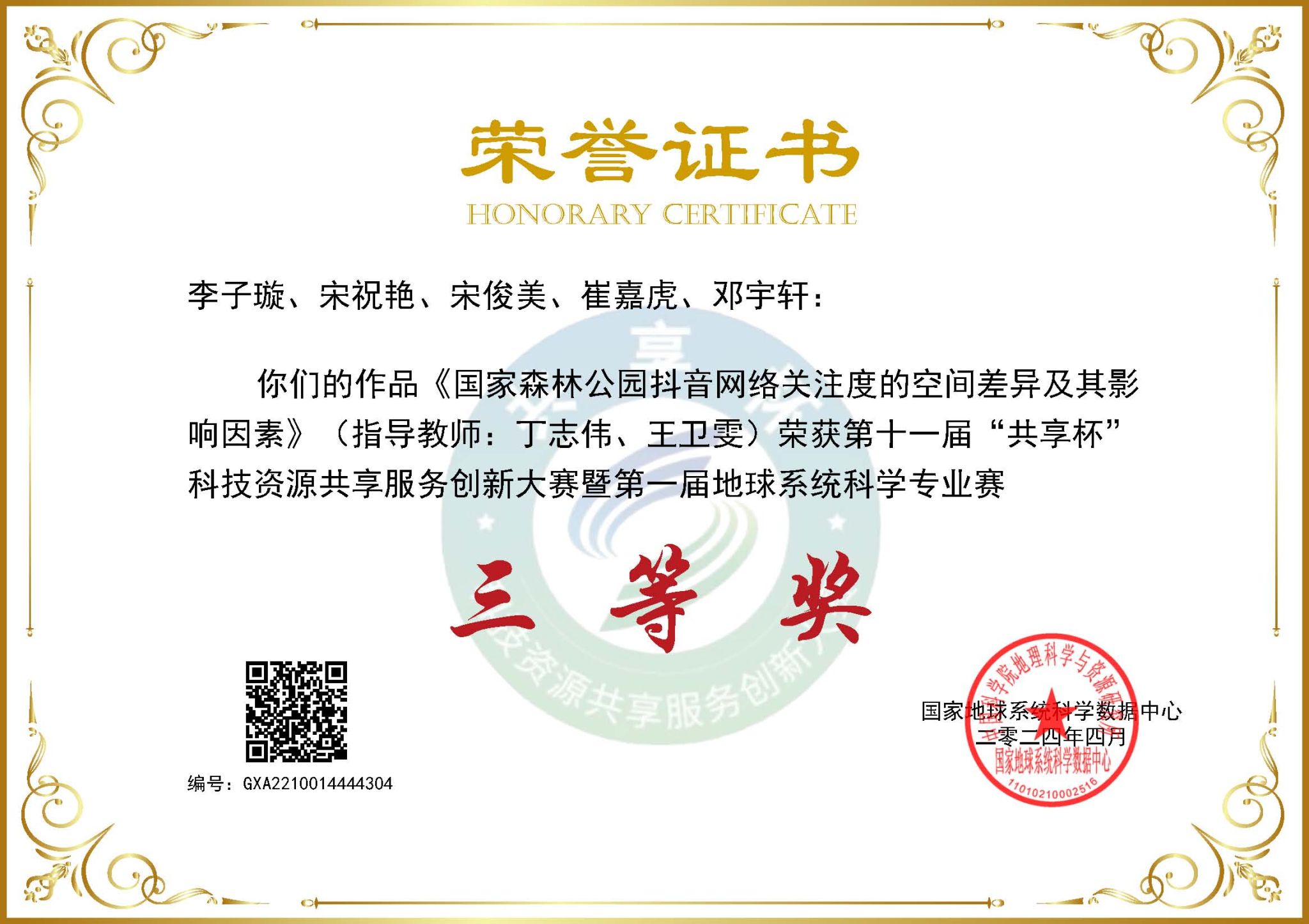 、黄河文明和可持续发展研究中心等部门积极宣传和组织,选派本科生、研究生多支队伍参赛。其中,于佳甜、李晗组成的研究生团队作品《中国农村抖音网红发育水平的空间分异及影响因素分析》(指导老师:丁志伟、张改素)获得全国特等奖,丁志伟老师荣获优秀指导教师;李佳欣、李金宽、张柯榆、刘娅萌组成的研究生团队作品《伏牛山高海拔华山松径向生长对气候变化的响应及稳定性评估》荣获全国二等奖(指导老师:彭剑峰);李子璇、宋祝艳、宋俊美、崔嘉虎、邓宇轩组成的本科生团队作品《国家森林公园抖音网络关注度的空间差异及其影响因素》(指导老师:丁志伟、王卫雯),李郭宇、李蕍、桂诗源、张文硕、帅志豪组成的本硕团队作品《面向双碳战略的卫星遥感监测与反演系统》(指导老师:曹堃、张磊),李金宽、李佳欣、张珂榆、刘娅萌组成的研究生团队作品《过渡带马尾松早晚材径向生长对气温突变的响应》荣获全国三等奖(指导老师:彭剑峰)。