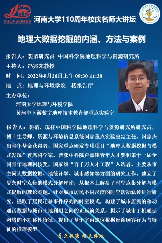 河南大学110周年校庆名师大讲坛:地理大数据挖掘的内涵、方法与案例