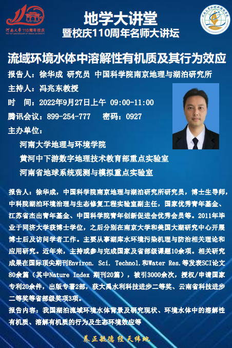 河南大学110周年校庆名师大讲坛:流域环境水体中溶解性有机质及其行为效应