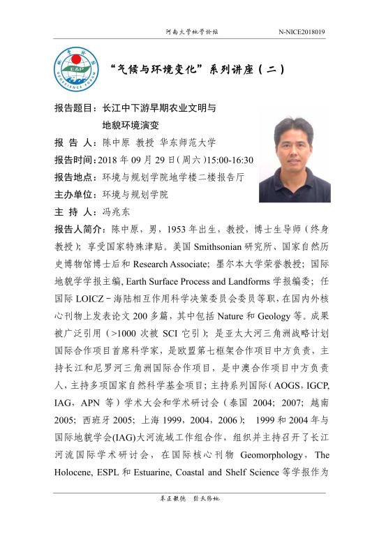 【地学论坛】陈中原:长江中下游旱期农业文明与地貌环境演变(时间:9.29,15:00-16:30)