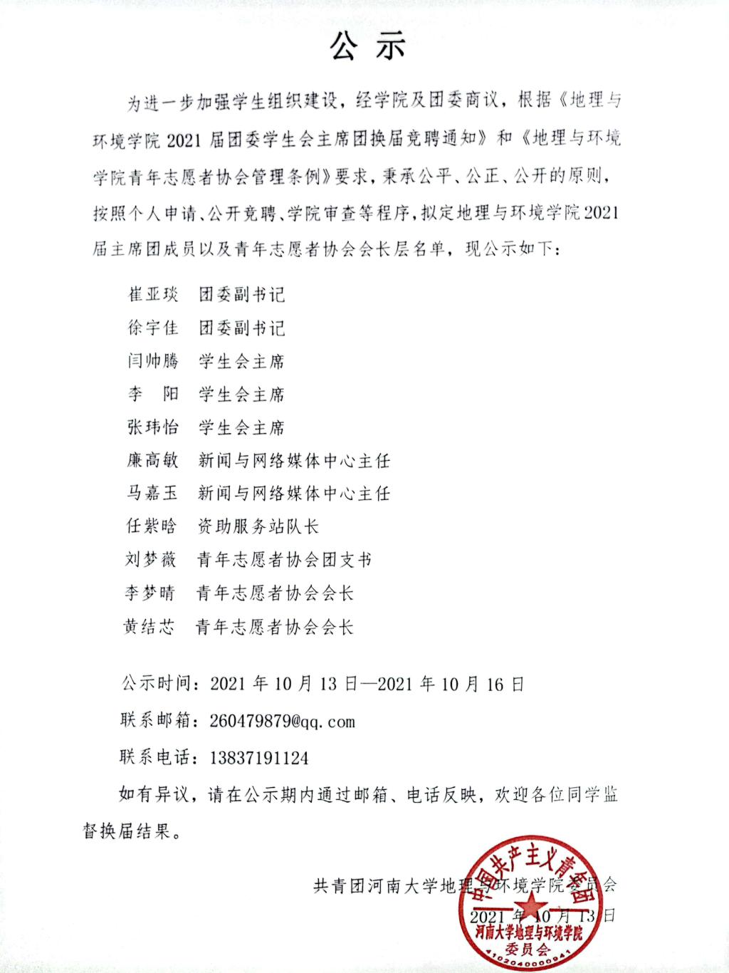 【公  示】球探足球比分网 2021届团委学生会主席团及青年志愿者协会会长层任职公示